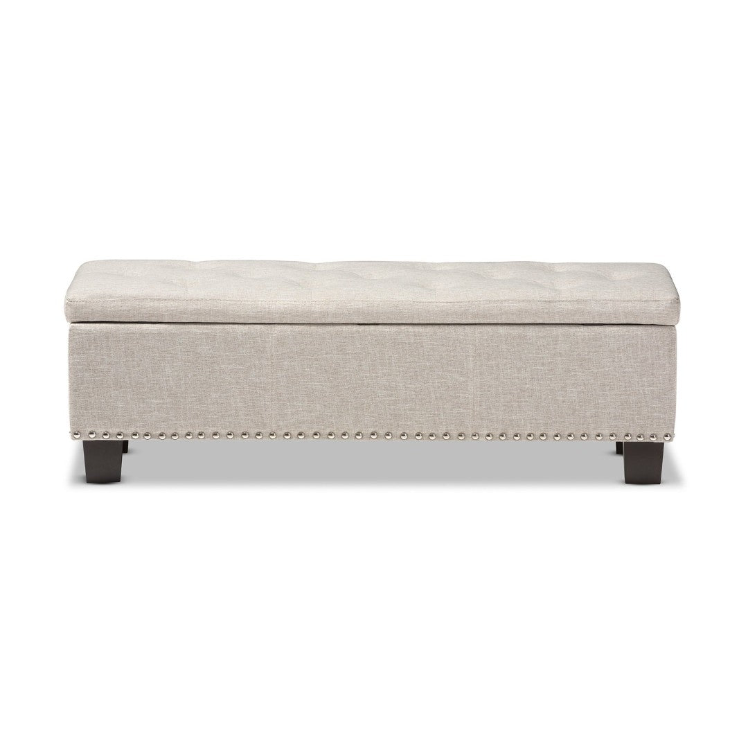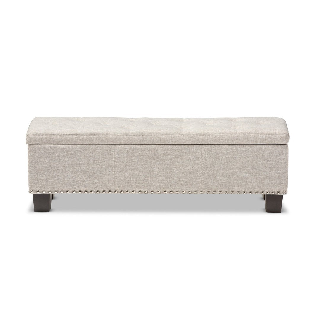 Add instant style and smart functionality to your bedroom or living room with this modern storage ottoman bench. Softly upholstered and finished with elegant button-tufting and silver nailhead trim, it provides a plush seat, deep hidden storage and a sturdy foundation — ideal as an end-of-bed bench, hallway accent or extra seating when guests arrive. Constructed on an eco-friendly solid rubberwood frame and available in multiple neutral and statement colors, this piece balances contemporary design with everyday practicality.