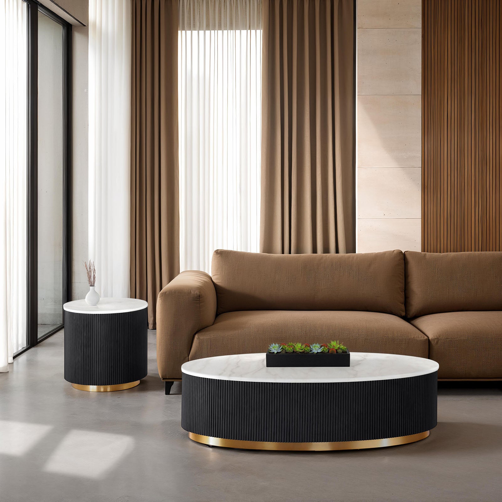- Design highlights: Oval and round tabletops for layered styling; reeded plinth base adds texture and visual interest; gold trim provides a polished, upscale contrast.