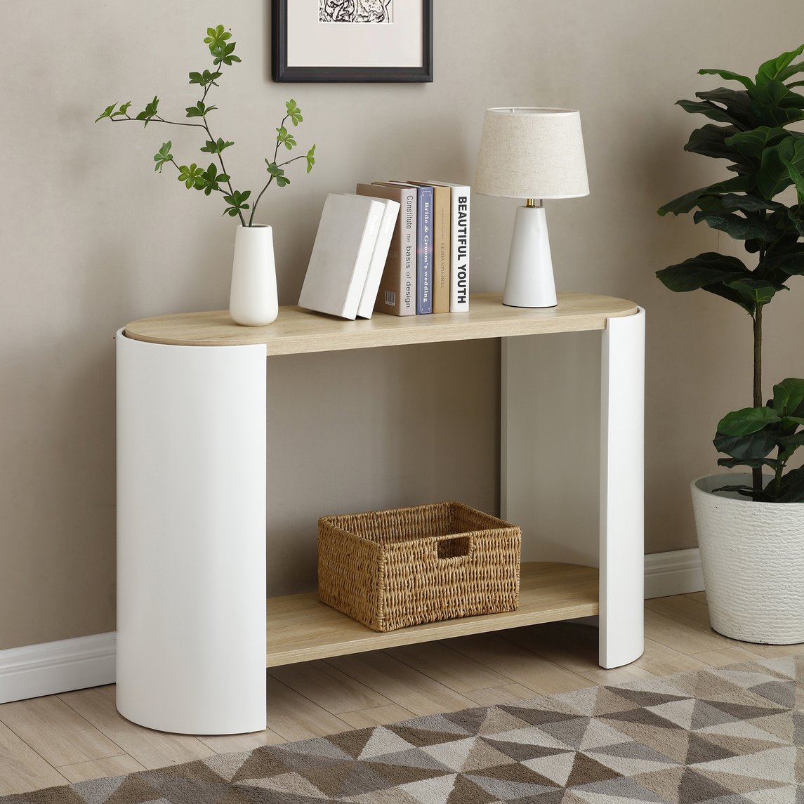 Brighten small spaces with this modern, two-tier end table that balances style and function. Its round top and lower shelf offer convenient surface area for a lamp, books, or decor while the clean natural-and-white finish complements a variety of interiors—from living rooms and bedrooms to entryways and dorms. Built with durable materials and a stable alloy-leg frame, this compact side table is designed for everyday use and easy assembly.