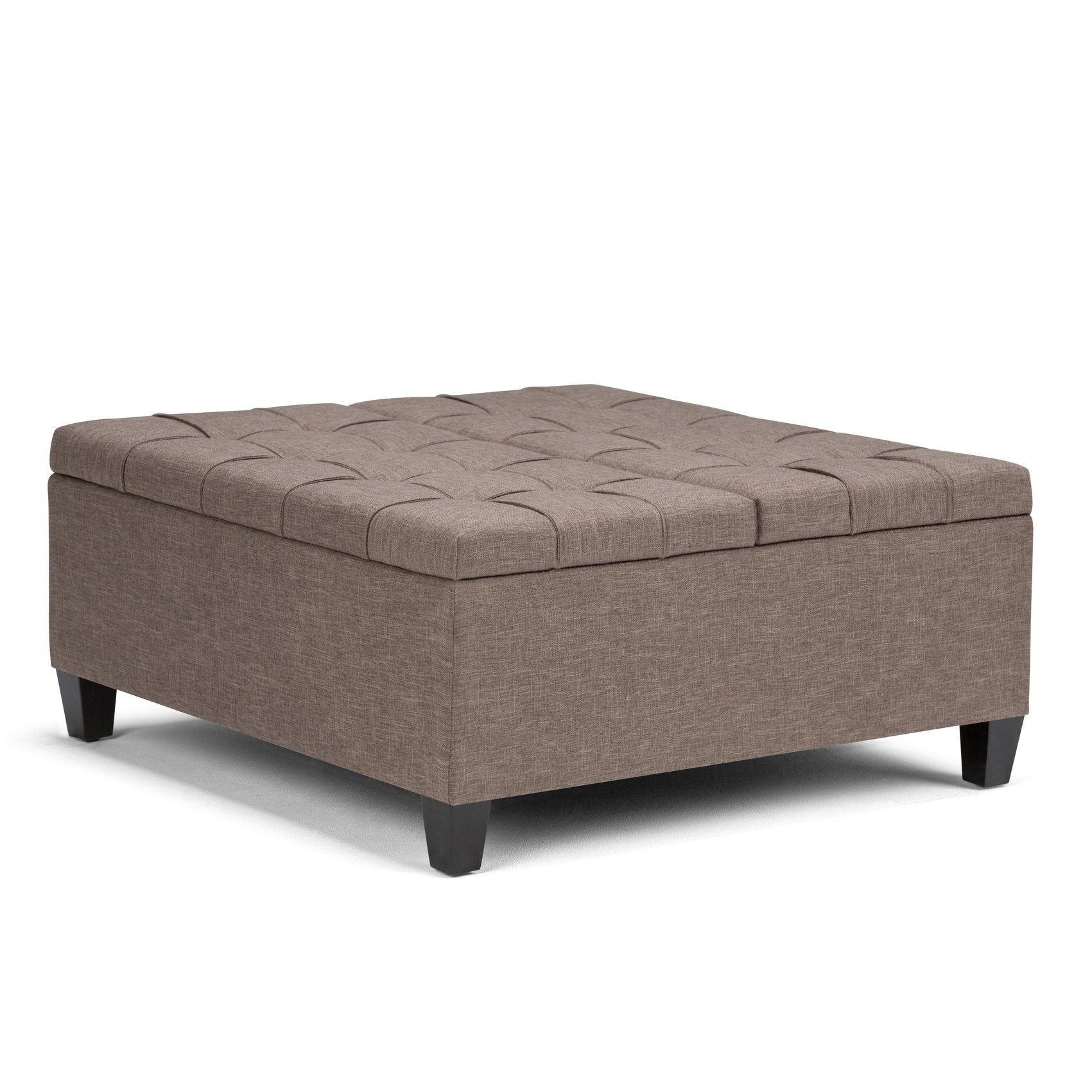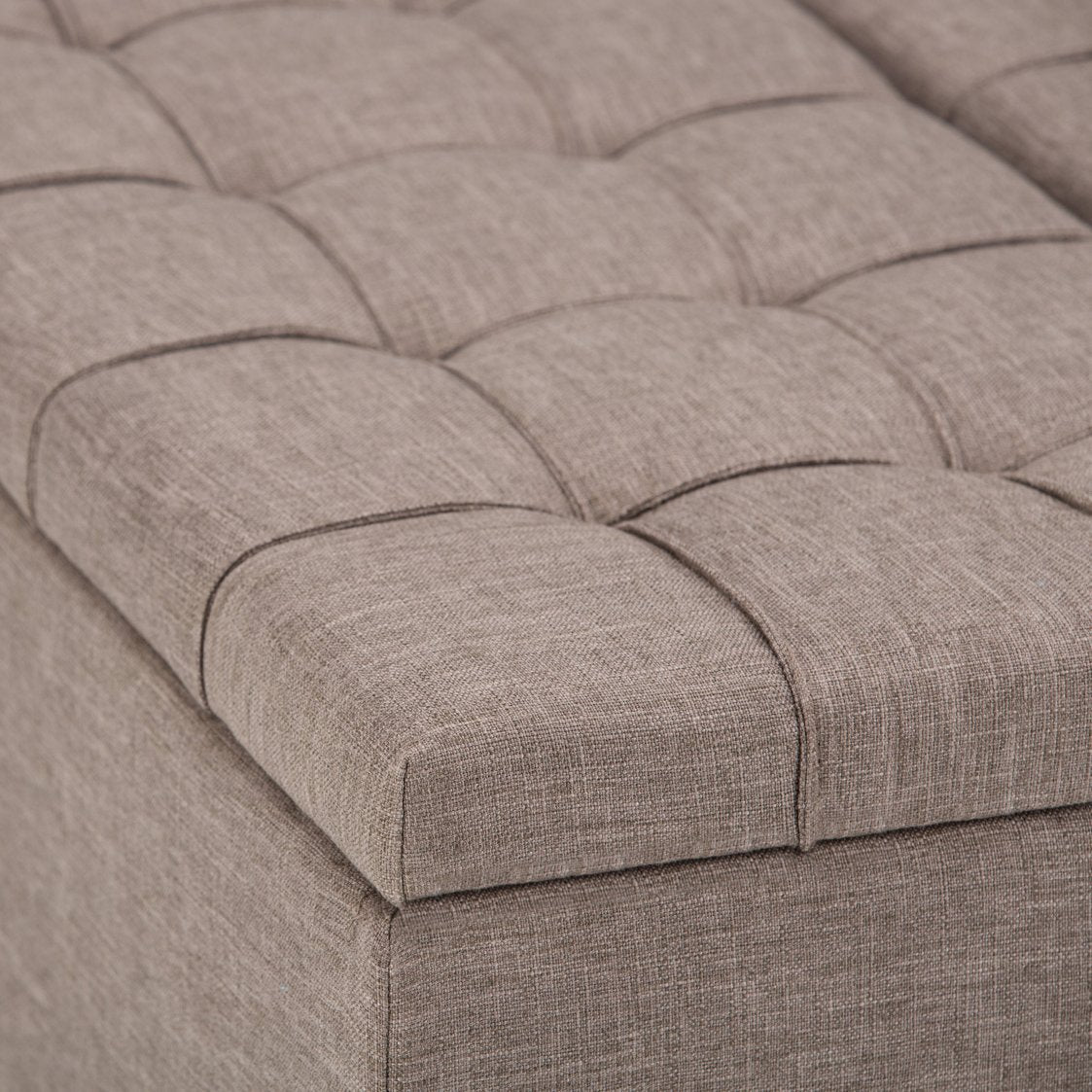 Bring versatile style and smart storage to your living space with this multi-functional storage ottoman. Upholstered in a durable fawn brown linen-look fabric with stitched tufting, it serves as a centerpiece for seating, casual dining, or as a coffee table while keeping extra items neatly tucked away. Thoughtfully constructed with solid and engineered wood, high-density foam, and a child-safe split lift top, it blends comfort, durability, and everyday practicality in one transitional piece.