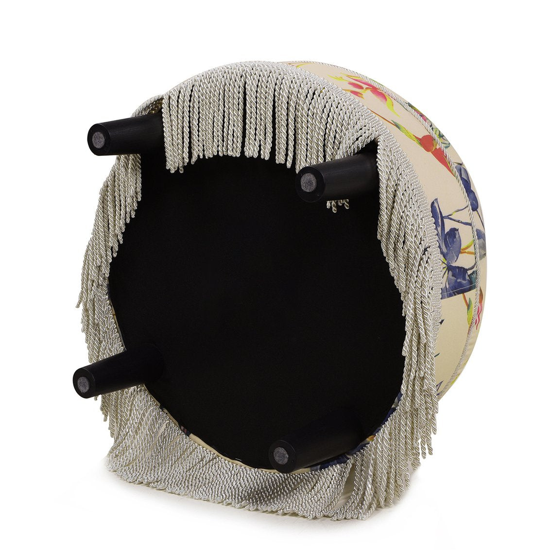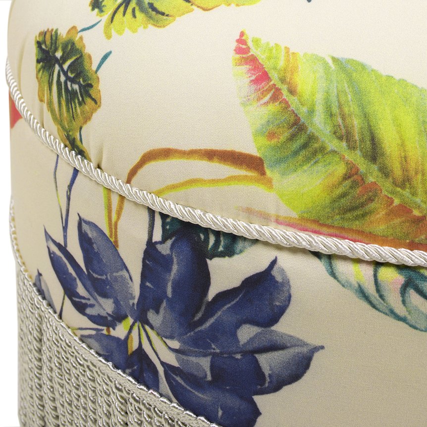 Add a touch of timeless elegance to your living space with this round upholstered accent ottoman. Crafted for durability and comfort, its beige tropical floral fabric and ivory trim combine classic styling with a subtly vintage feel—ideal as extra seating, a footrest, or a decorative centerpiece.