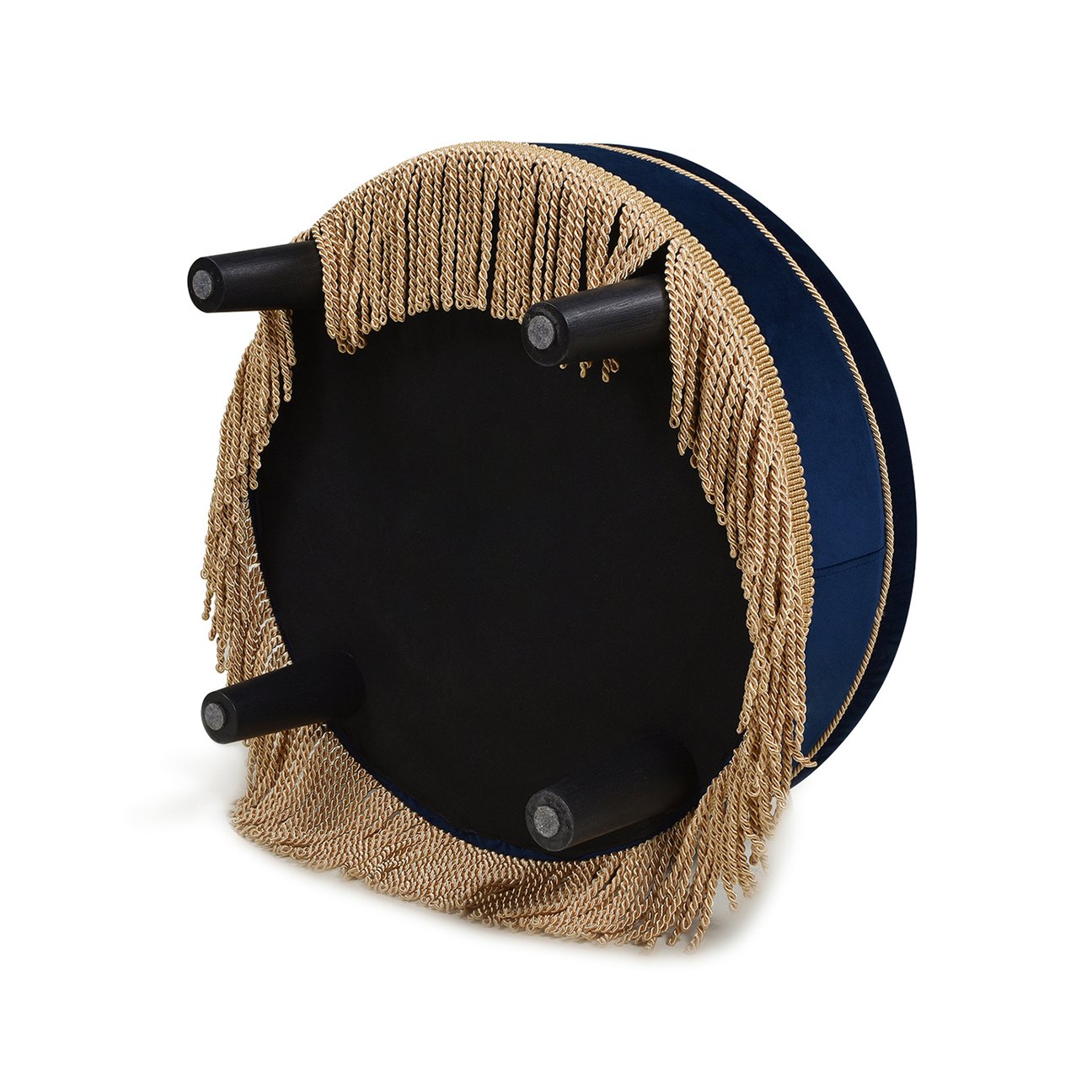 Elevate your living space with this elegant round upholstered ottoman that blends vintage charm and modern durability. Perfect as a footrest, extra seating, or a decorative centerpiece, its navy blue velvet, gold trim, and tassel bullion fringe create a refined, timeless look while construction details ensure lasting comfort and support.