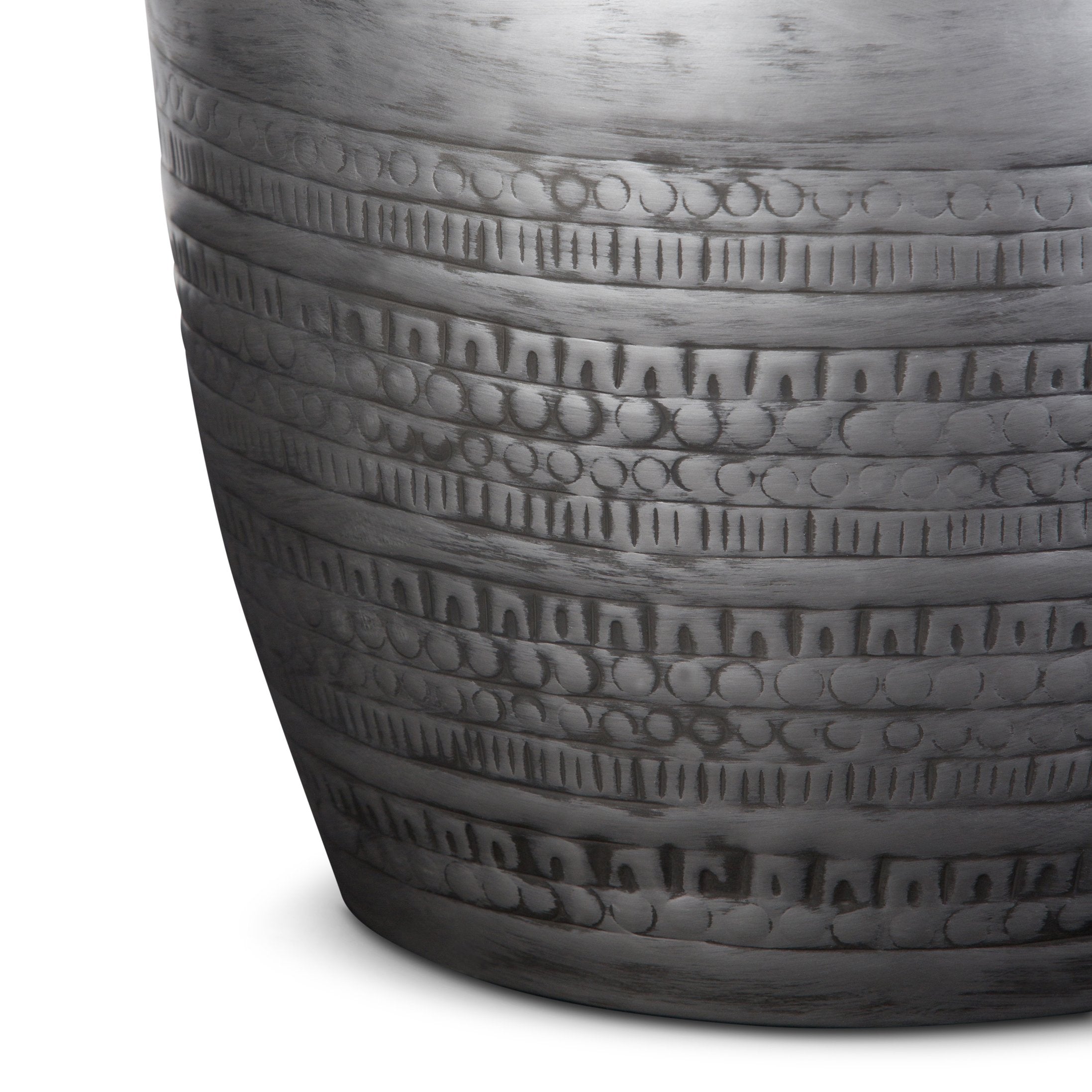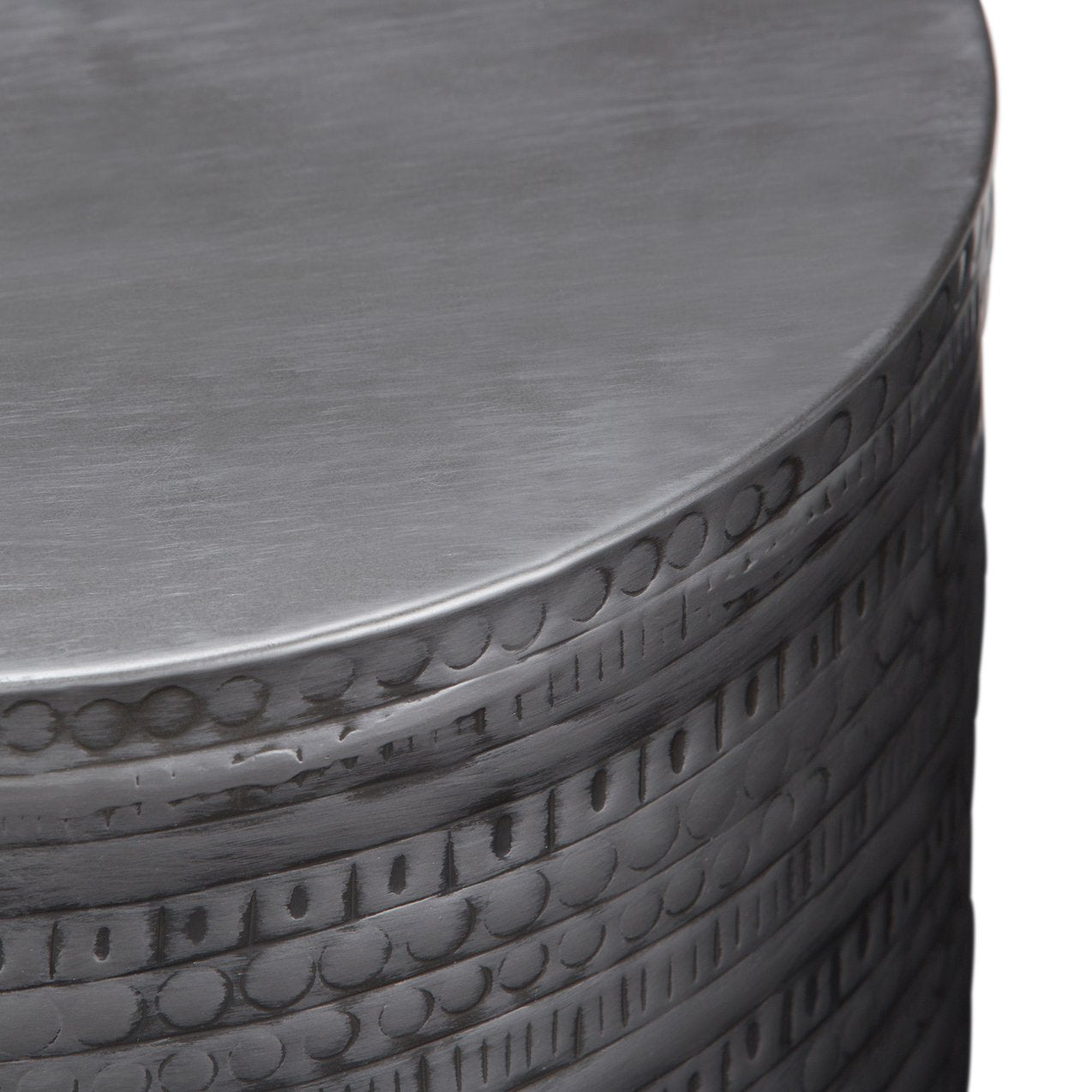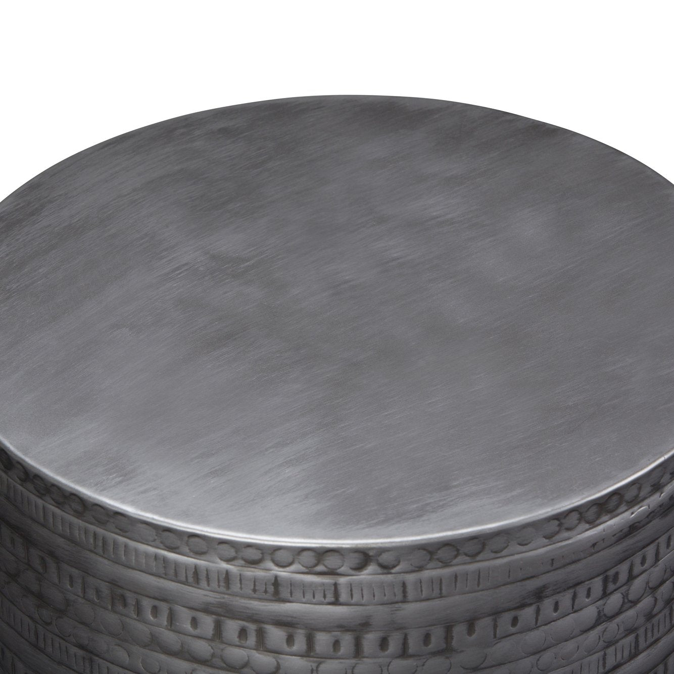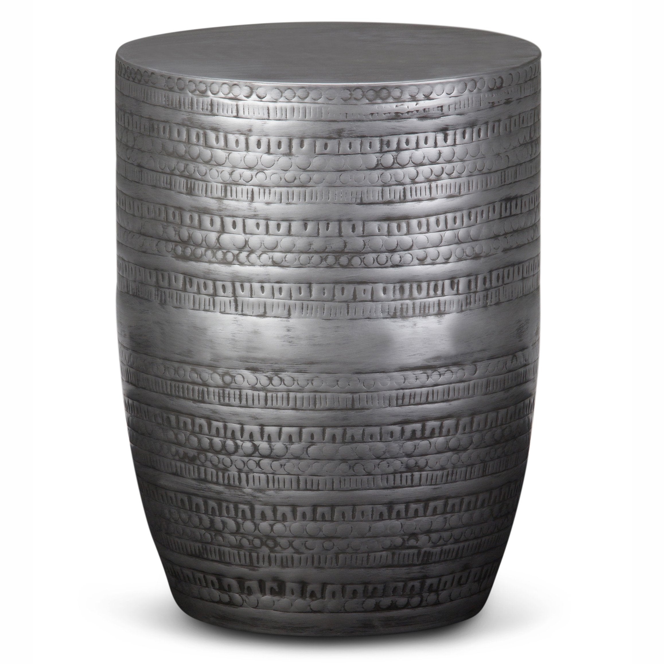 Add a touch of global-inspired style to your space with this handcrafted metal accent table. Its tribal-patterned drum shape, finished in antique silver, blends boho charm with modern versatility—perfect as an end table, bedside surface, or decorative accent in living rooms, condos, bedrooms, or offices. Durable solid metal construction and a textured finish create visual interest while providing a sturdy, ready-to-use piece.