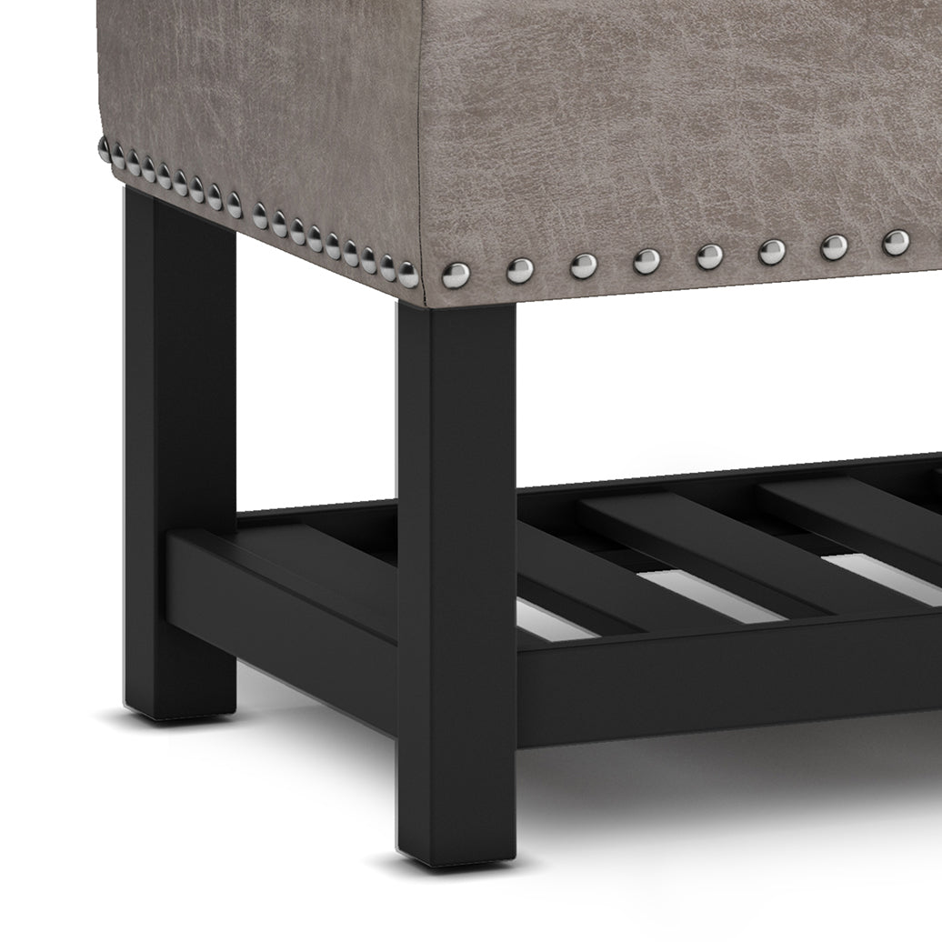 Add a touch of transitional elegance and everyday utility to your home with this versatile storage ottoman bench. Upholstered in distressed grey-taupe vegan faux leather and accented with tufting and nailhead trim, it blends classic styling with modern functionality — offering comfortable seating, generous hidden storage, and an open slatted lower shelf for shoes or display. Built with solid wood and plywood framing and a child-safety hinged lift-top, it’s equally suited to the entryway, living room, bedroom, or hallway.