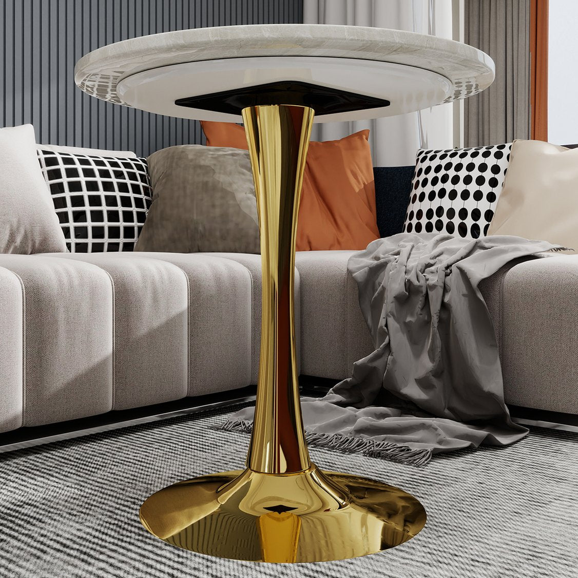 - This round side table showcases a white marble - like tabletop paired with a luxurious gold - toned pedestal base. The smooth, elegant tabletop provides an ideal surface for placing drinks, decorative items, or small snacks. Its eye - catching gold base, with a glossy finish, adds a touch of opulence to any living space, making it a stylish centerpiece that effortlessly combines functionality and high - end aesthetics.