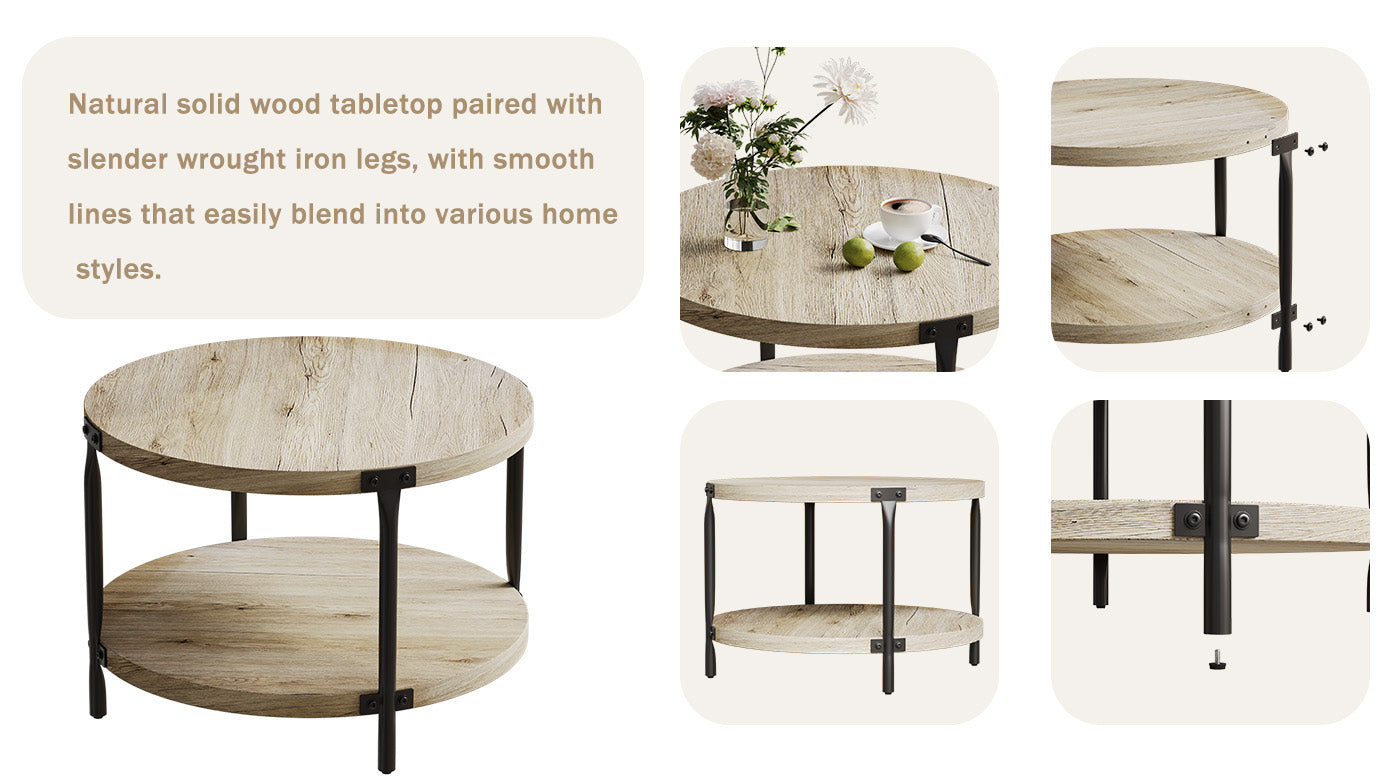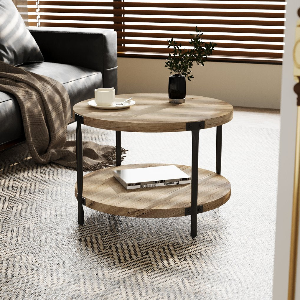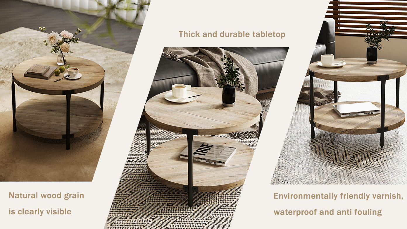 Bring a clean, contemporary look to your living space with this modern minimalist round coffee table. Designed for versatility, it combines a warm wood finish and a sleek metal frame with practical double-layer storage—perfect for organizing magazines, remotes, and everyday items while keeping surfaces clutter-free. Its compact footprint and easy assembly make it an ideal choice for living rooms, studies, bedrooms, or multipurpose areas.