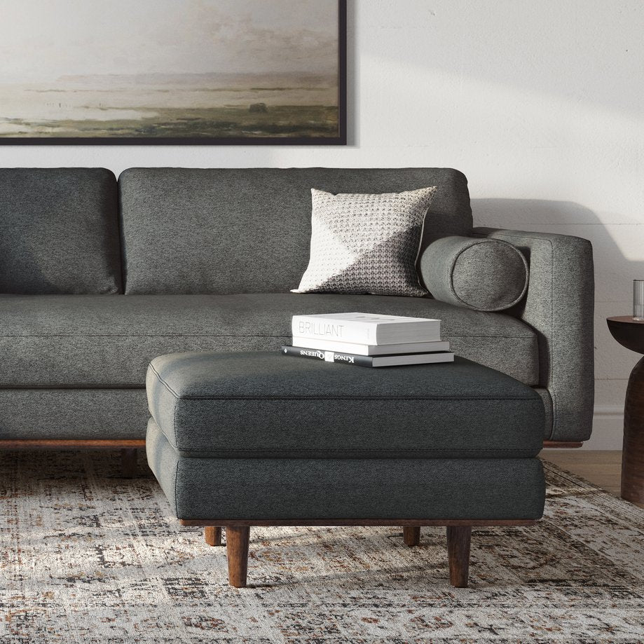 Refresh your living space with the Morrison Ottoman — a handcrafted, mid-century modern piece that blends form and function. Upholstered in a durable charcoal grey woven-blend fabric made with recycled fibers, this ottoman works as a comfortable footrest, an impromptu coffee table, or paired with matching Morrison seating to create a flexible sectional. Built to last with a sturdy frame, supportive cushioning, and simple assembly, it brings sustainable style and everyday practicality to your home.