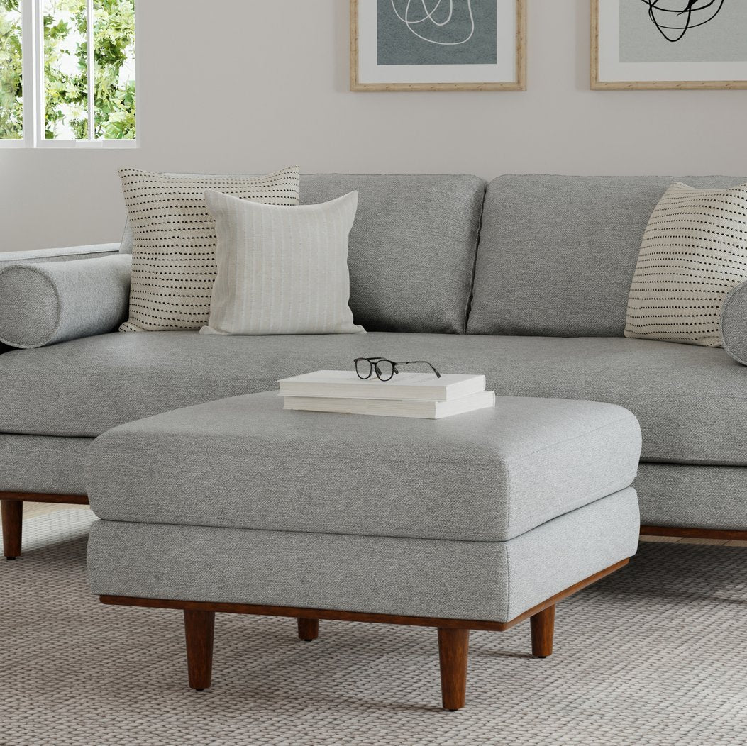 Add a finishing touch to your living space with the Morrison Ottoman in Mist Grey — a handcrafted, mid-century modern piece designed for comfort, versatility, and long-lasting performance. Whether used as a footrest, extra seating, an impromptu coffee table, or paired with a Morrison sofa to form a flexible sectional, this ottoman combines durable construction with refined, eco-conscious upholstery for everyday use.