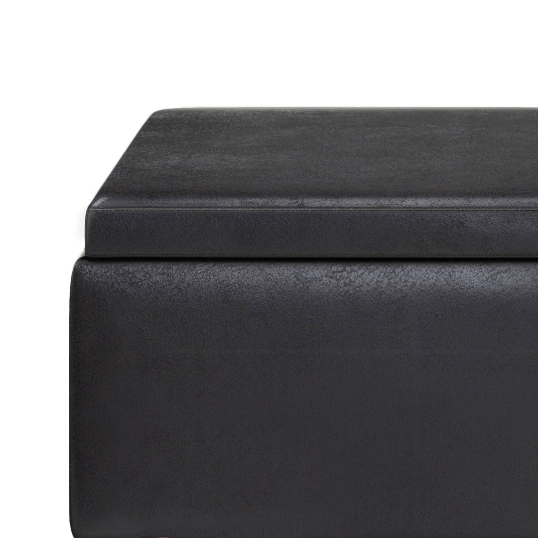 This versatile piece blends mid-century style with practical storage and functionality — perfect as a coffee table, extra seating, or a decorative accent. Upholstered in distressed black vegan faux leather and built with a solid wood frame, it offers a refined look and durable performance for living rooms, family rooms, or multipurpose spaces.
