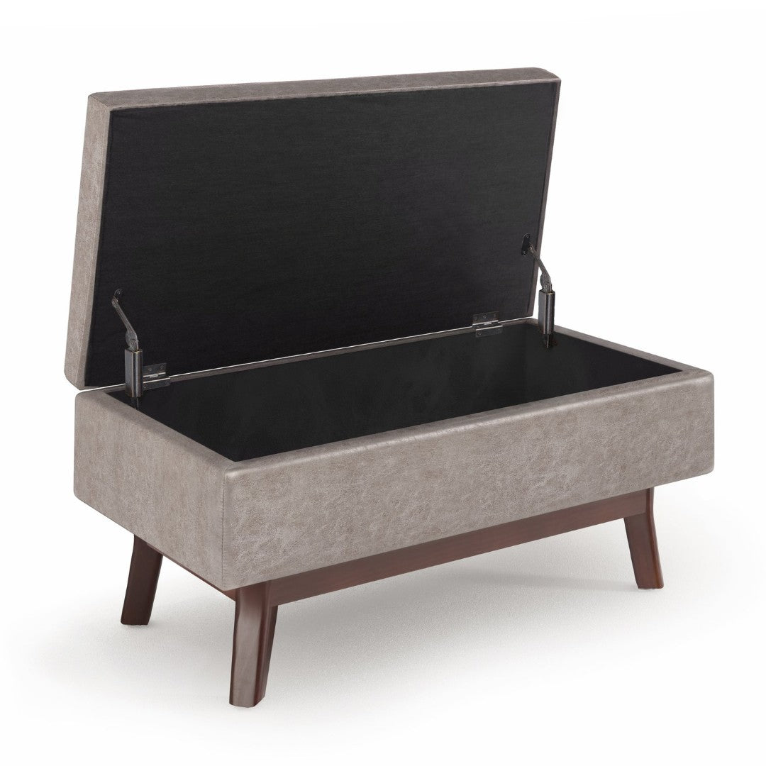 Add a touch of mid-century charm and practical storage to your living space with this compact rectangular storage ottoman. Upholstered in distressed grey taupe vegan faux leather, it combines stylish texture with everyday functionality—perfect as a footrest, extra seating, or a discreet place to store blankets, pillows, and other essentials.