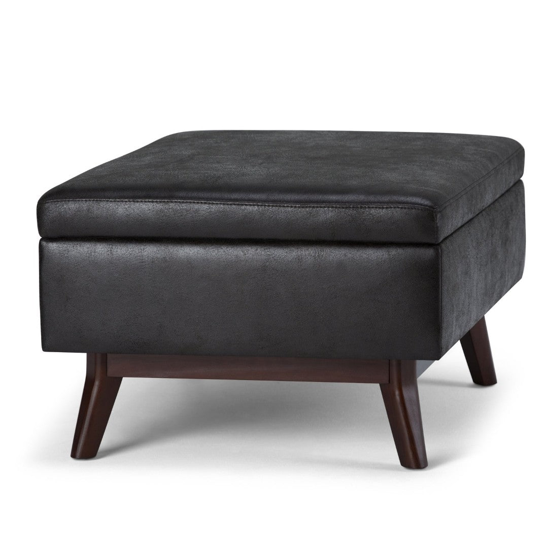 Elevate your living space with this versatile mid-century inspired storage ottoman. Upholstered in distressed black vegan faux leather, it combines stylish appeal with practical function—serving as a coffee table, extra seating, footrest, or hidden storage solution. Thoughtful construction and a child-safe hinge make it a durable, family-friendly addition to any living or family room.