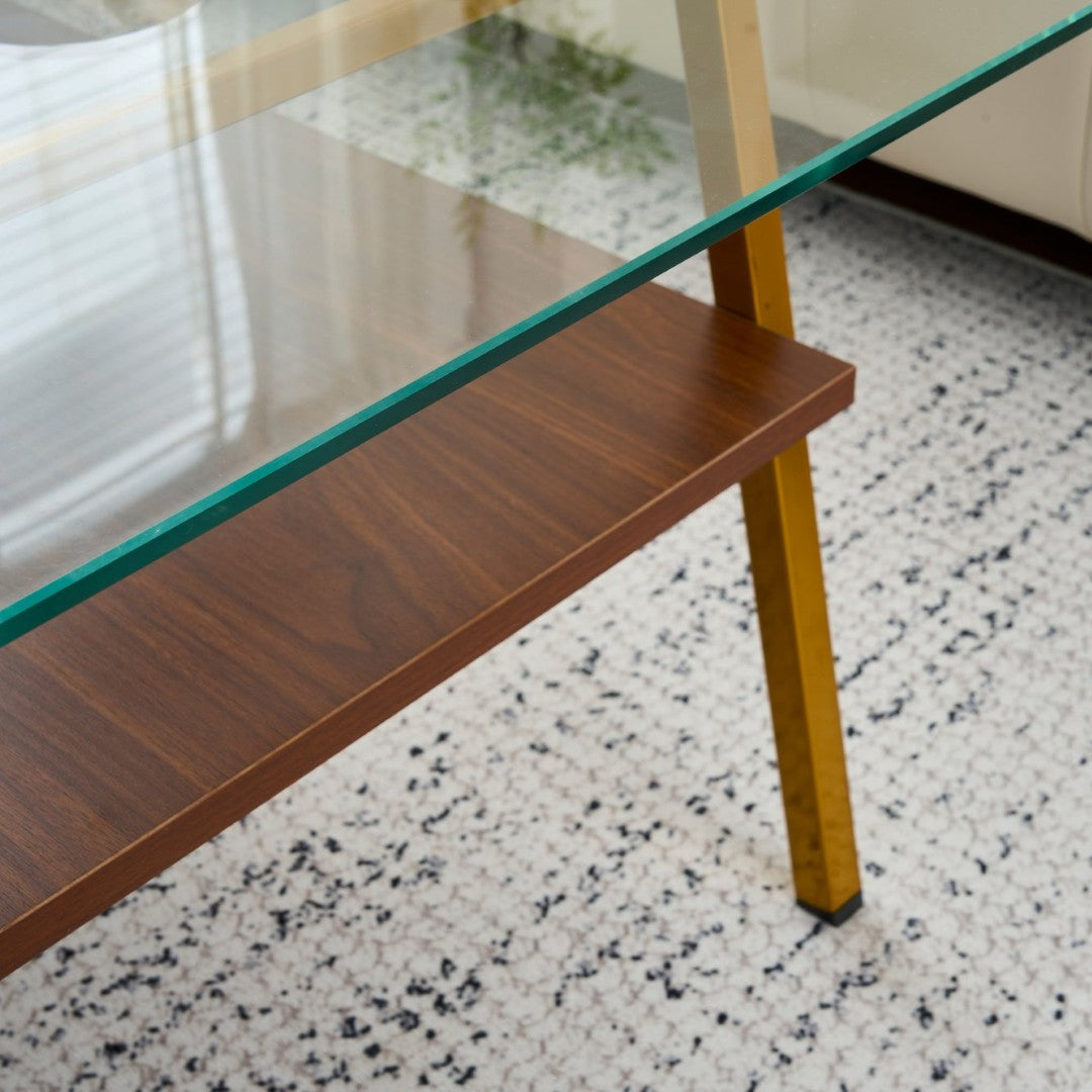 Elevate your living room with this modern rectangle coffee table that blends transparent tempered glass and warm gold metal legs for a refined, airy look. Designed for both style and everyday functionality, it pairs a sleek glass top with a durable MDF lower panel and robust metal supports to deliver stability, easy maintenance, and a contemporary centerpiece for your seating area.