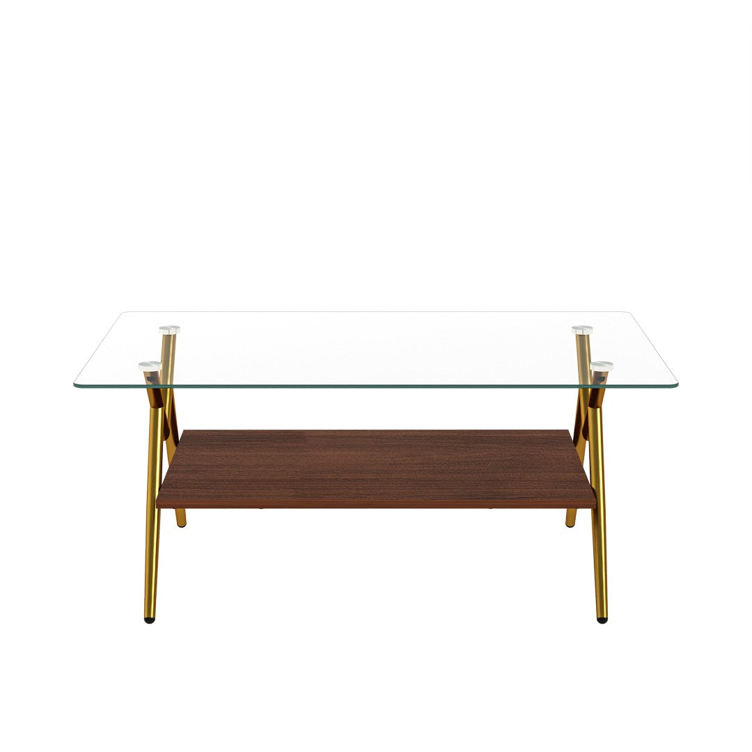 Give your living room a touch of modern elegance with this rectangular coffee table featuring a clear tempered glass top and chic golden metal legs. Its minimalist silhouette and mixed-material construction create a light, airy focal point that complements contemporary, modern, and glam interiors while offering durable everyday performance.