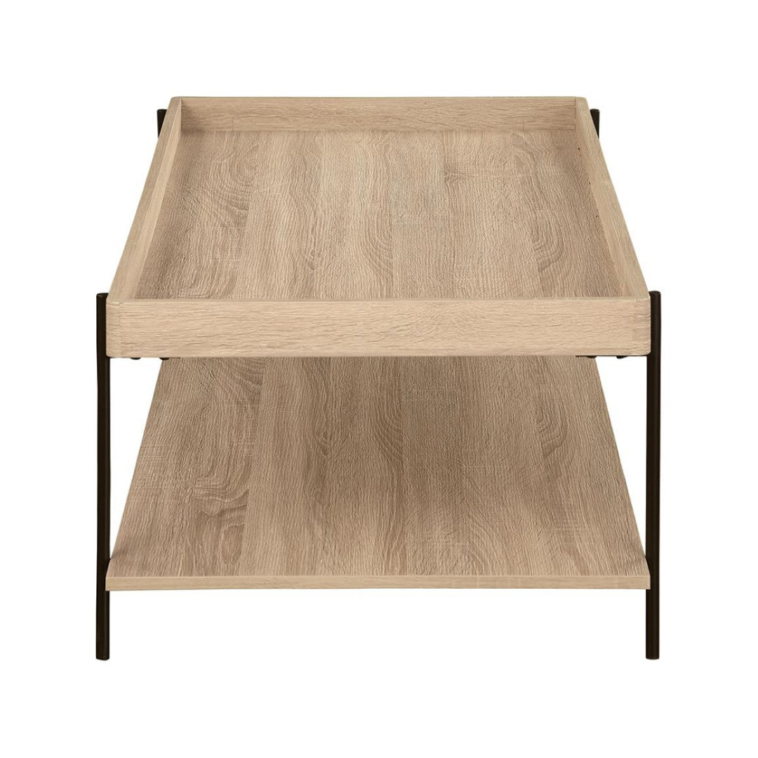 Bring rustic charm and modern simplicity to your living room with this rectangular farmhouse-style coffee table. Its light brown engineered wood top features a tray-like surface and wood-grain detail for a warm, natural look, while a slim black metal frame keeps the silhouette clean and contemporary. A full lower shelf adds practical storage and display space, making it ideal for everyday use and casual entertaining.