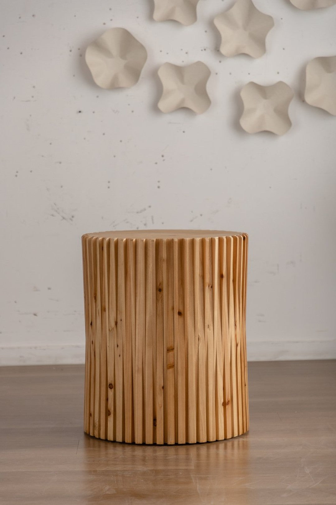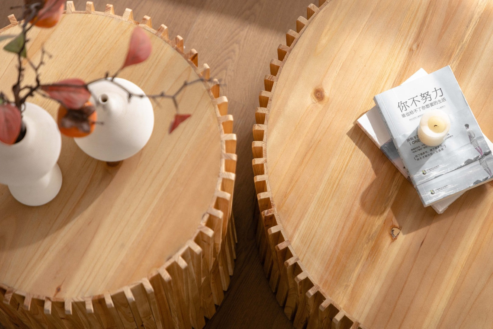 Bring a touch of retro modernity to your living spaces with this set of two cylindrical coffee tables. Each table features a vertical textured relief design and warm natural wood finish that highlights authentic wood character—knots, grain variations, and subtle color differences—giving your room an inviting, lived-in feel. These versatile pieces work well alone or nested together in living rooms, offices, or dining areas where both style and function matter.