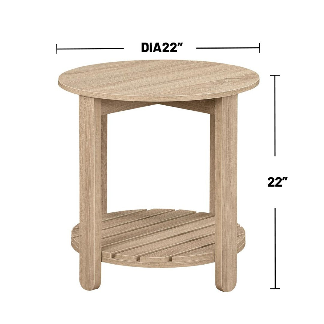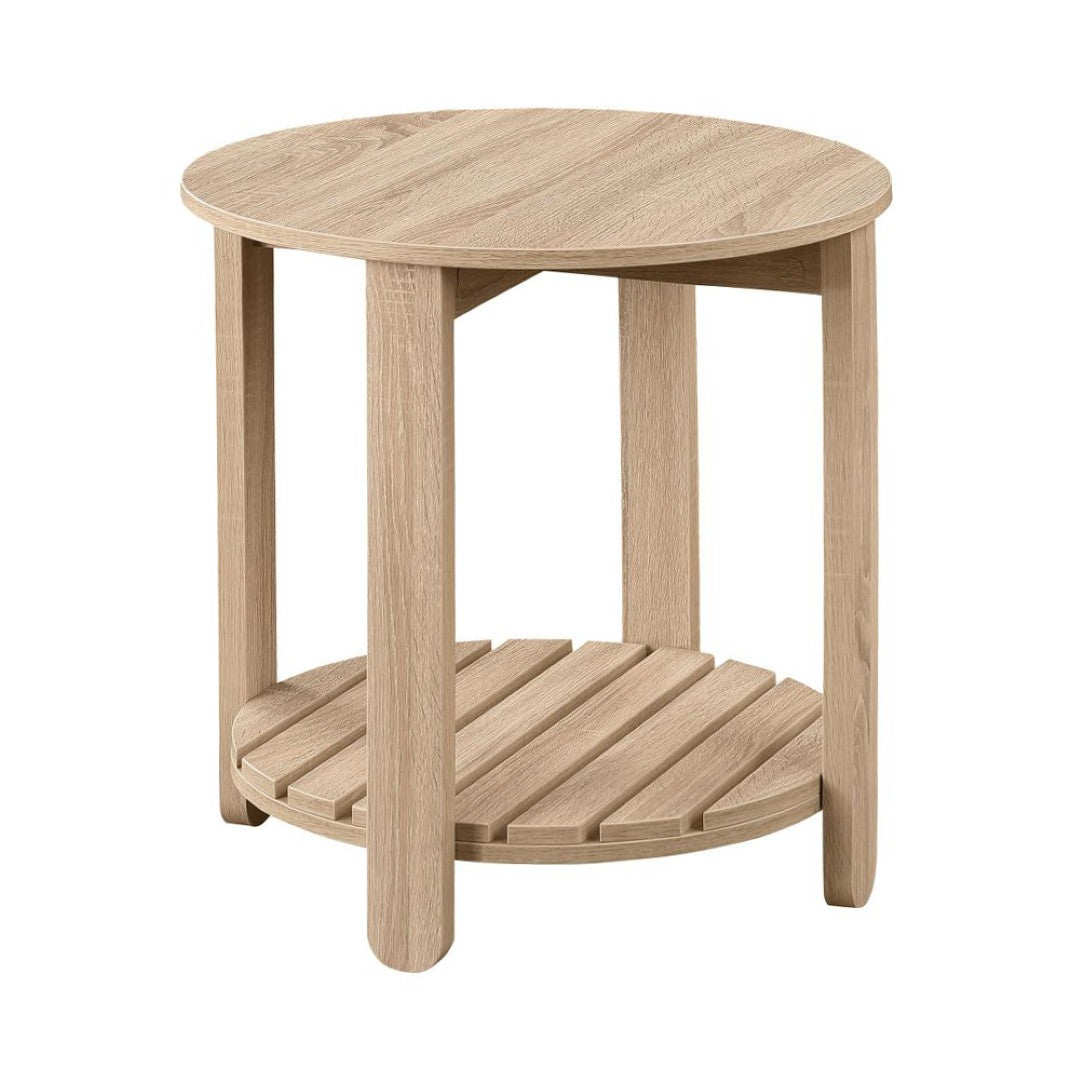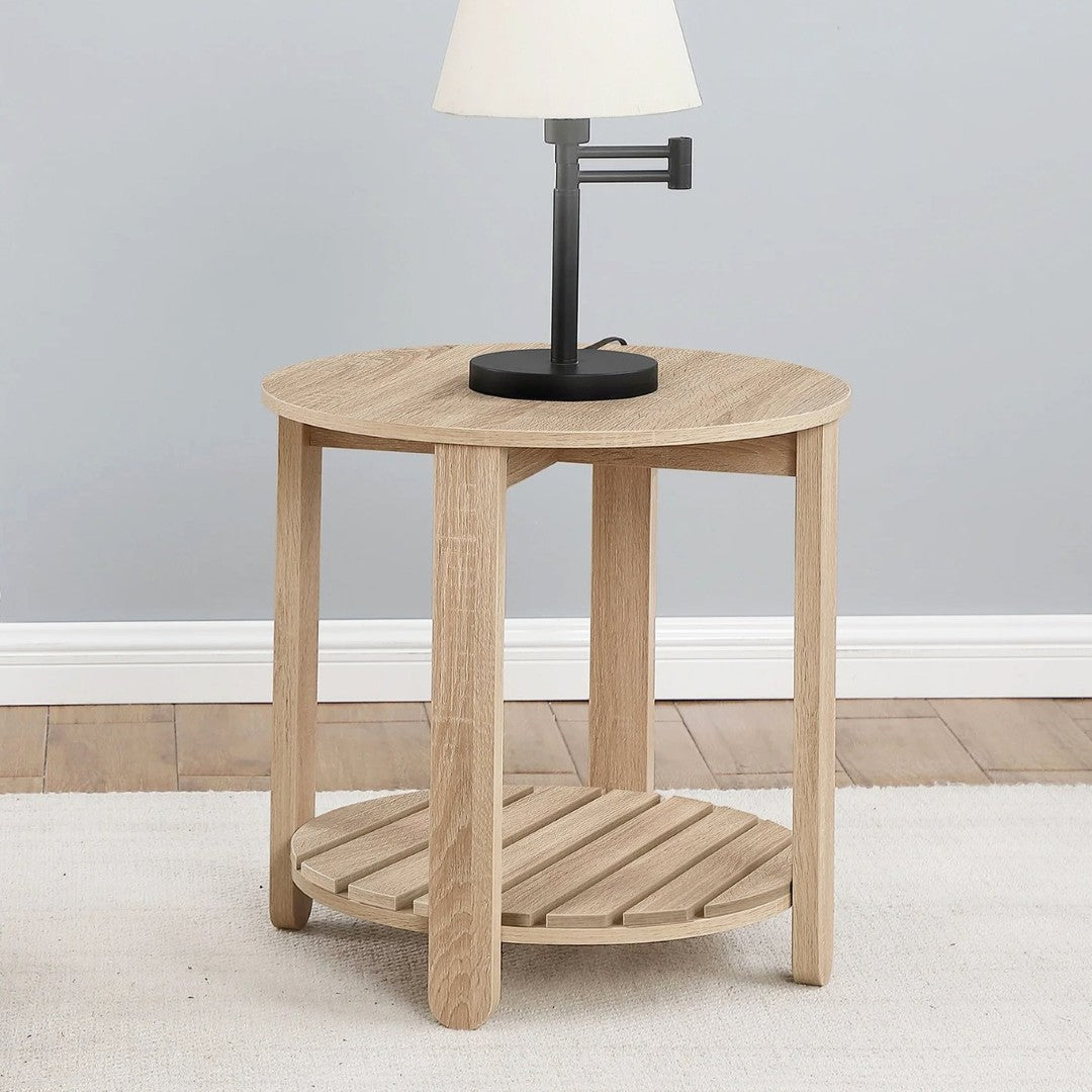 Bring effortless farmhouse charm to any seating area with this round side table crafted from durable engineered wood. Its warm natural finish, clean silhouette, and practical lower shelf make it a versatile accent piece that works equally well beside a sofa, in a sunroom, or on a covered porch.