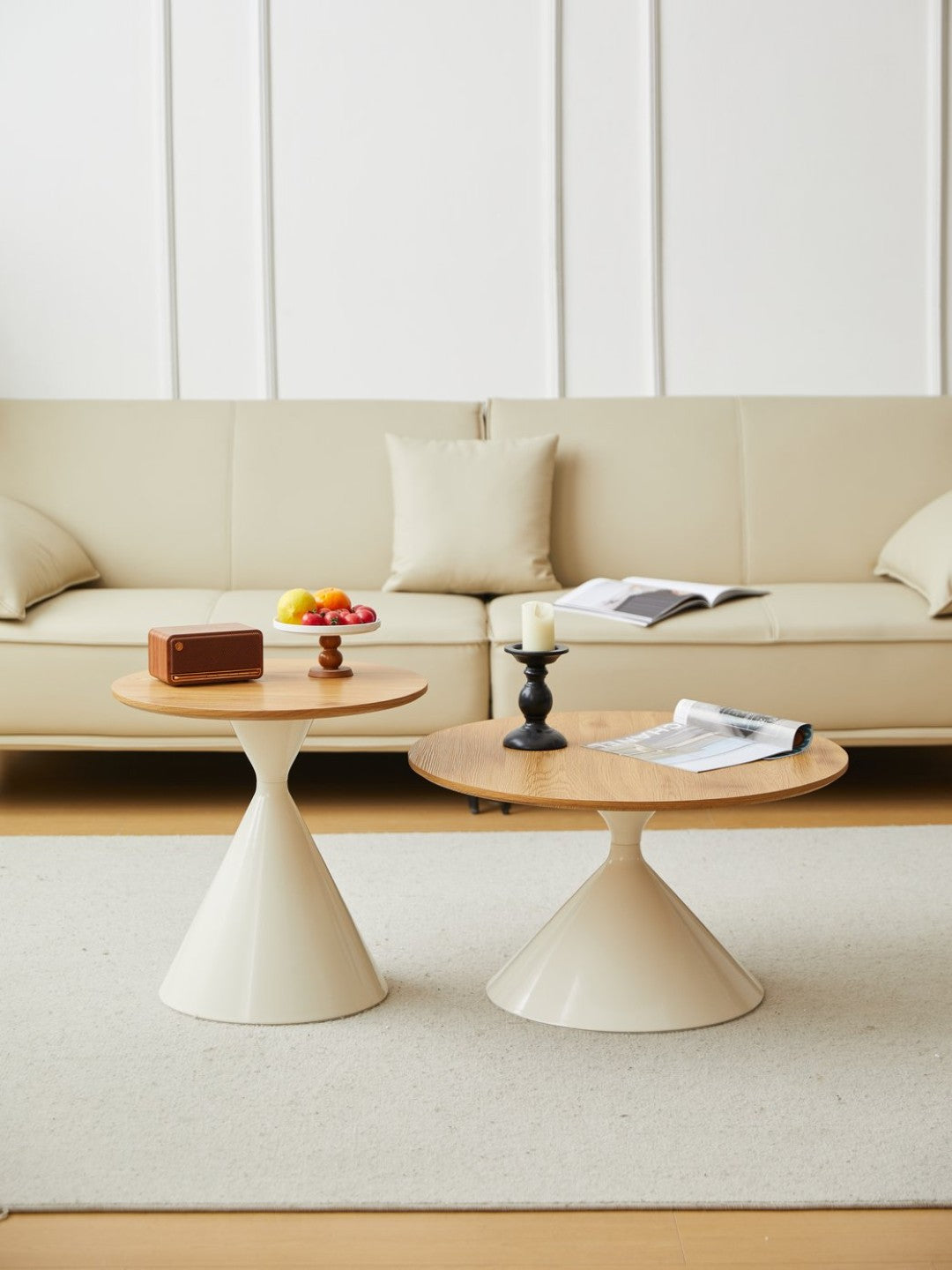 Refresh your living space with this modern two-piece round coffee table set that blends warm wood tones with crisp white accents. Designed for flexibility and style, the pair works beautifully together or separately as a coffee table and side table. Clean lines, a distinctive double-cone metal base, and quality materials make this set a practical focal point for contemporary, Scandinavian, or mid-century interiors.