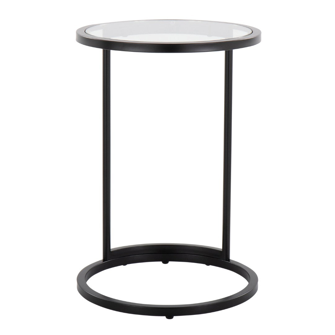 - The Round Zenn End Table by LumiSource features a gracefully cantilevered tempered glass shelf on a metal frame. Blending beautifully into various spaces, you couldn't ask for more from such a stylish end table. Available in an assortment of finishes, choose the one that best fits your space.