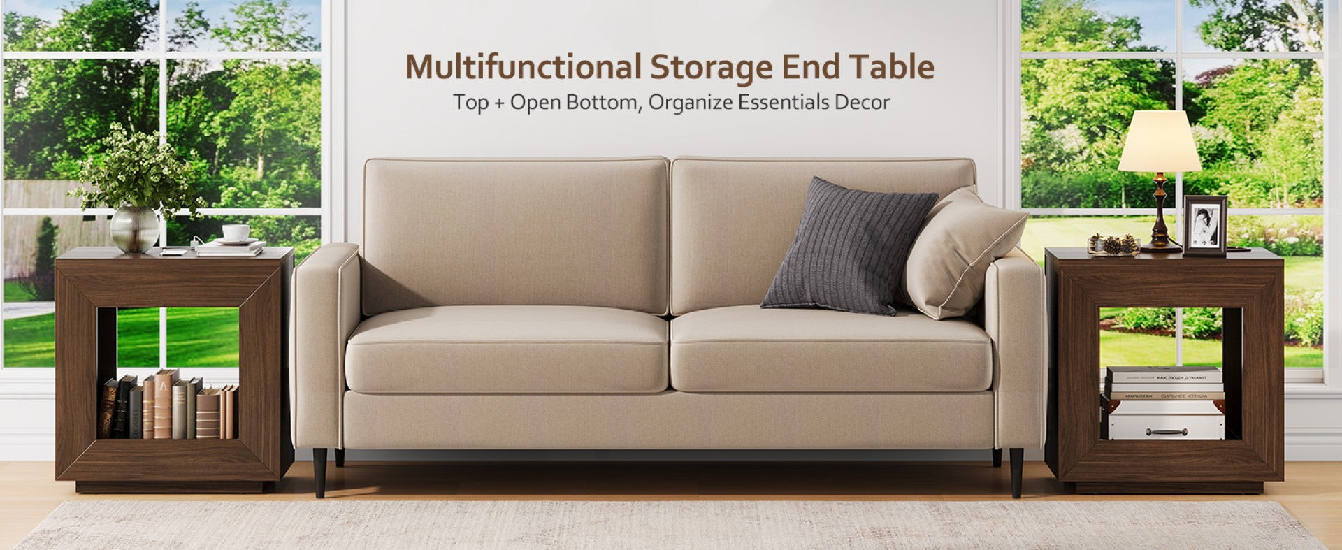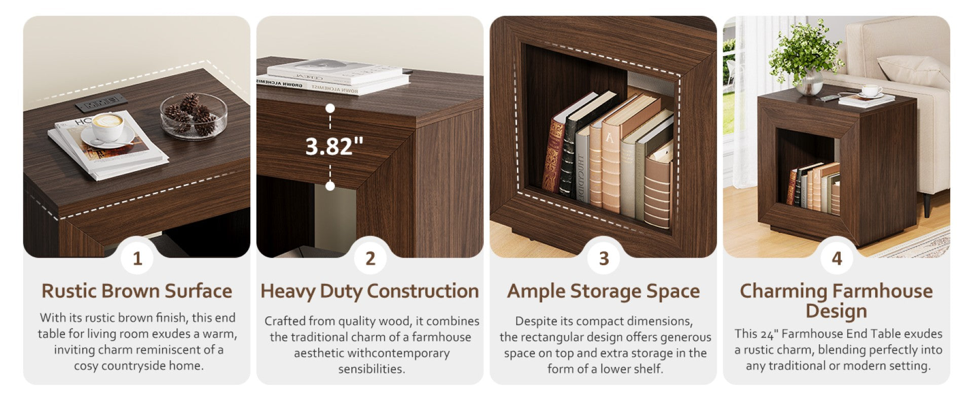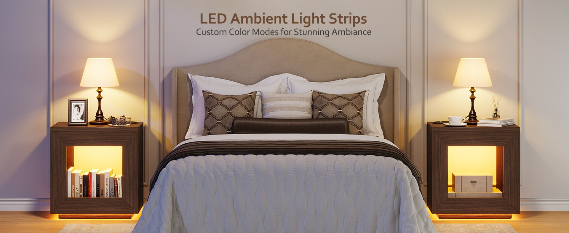 Bring rustic warmth and modern convenience to your living space with this 2-tiered square end table. Built with an industrial-inspired frame and a weathered brown finish, it combines sturdy storage, smart charging, and customizable LED ambient lighting to enhance both function and atmosphere beside your sofa, bed, or entryway.