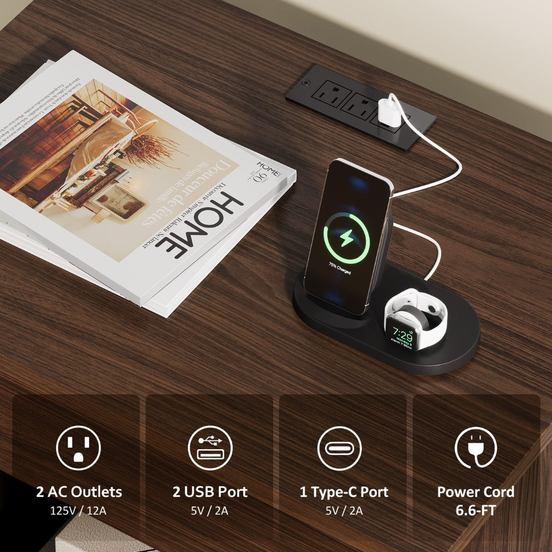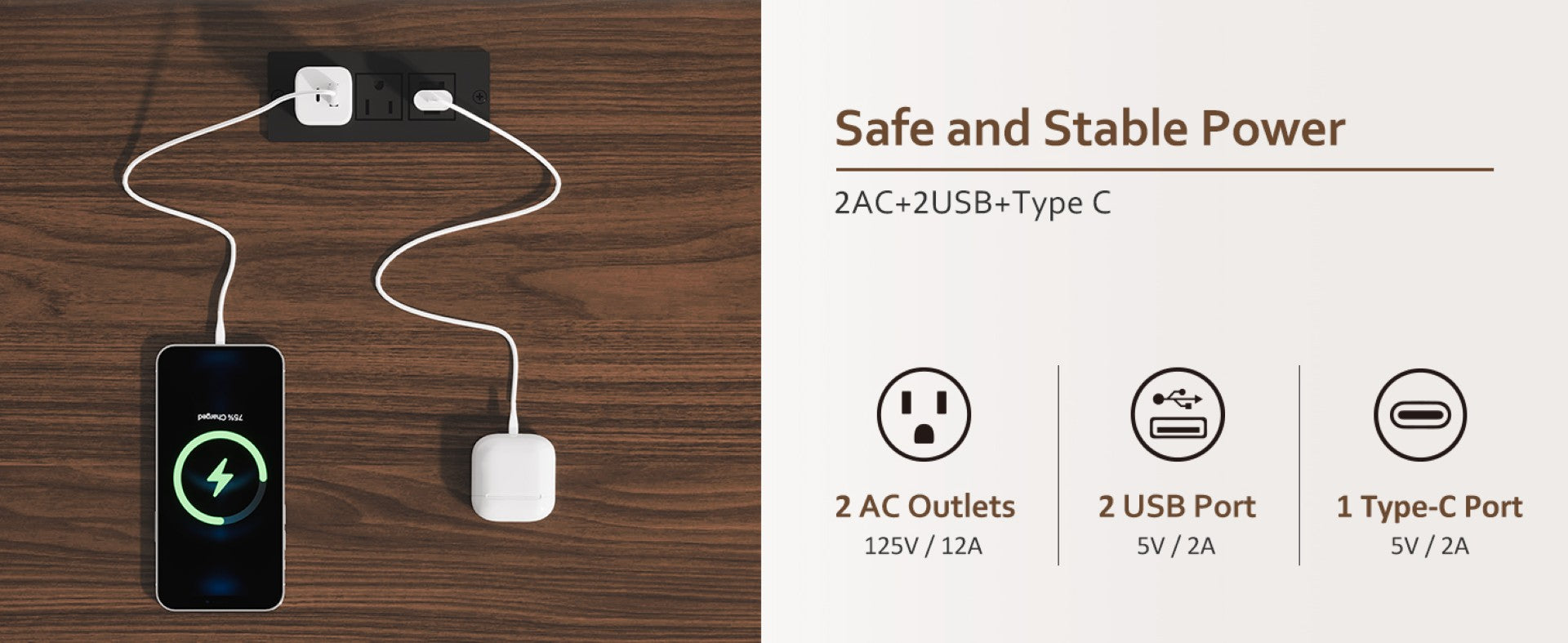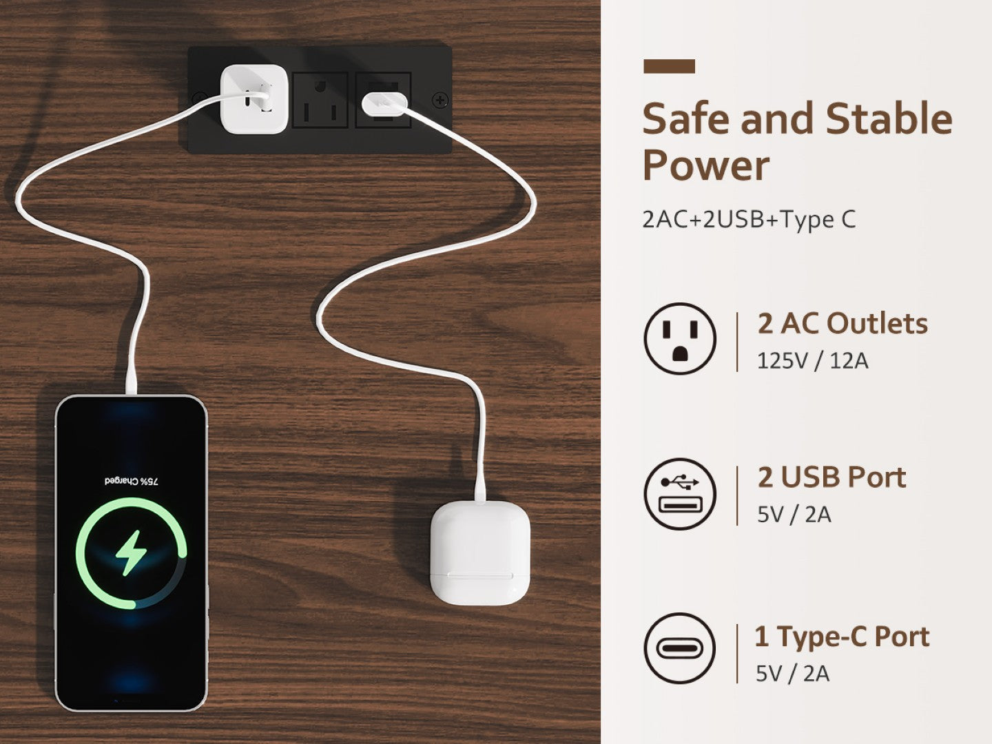 - Integrated power hub: 1 socket module with 2 AC outlets, 2 USB ports, and 1 Type-C port — charge phones, tablets, and lamps without moving items