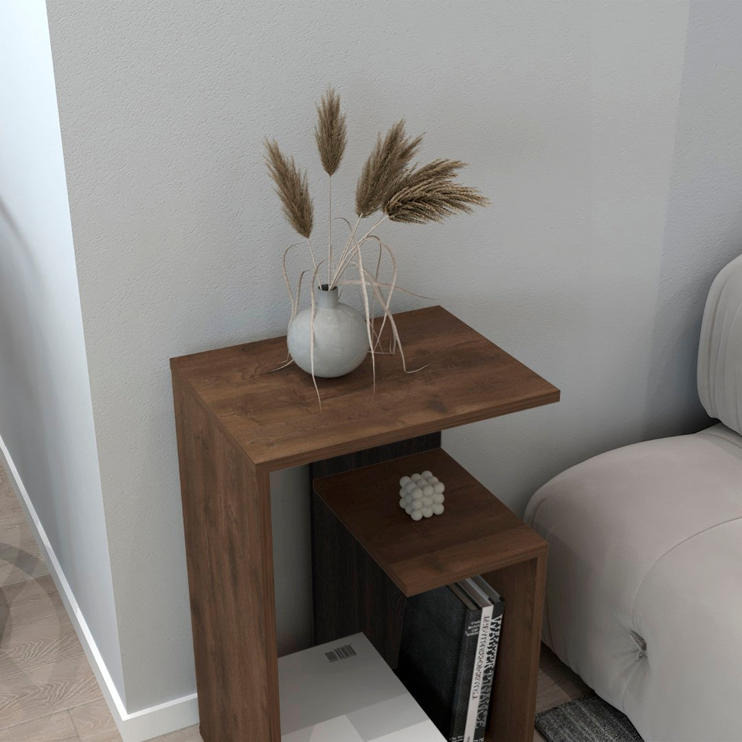 A compact, modern side table that blends practical storage with clean, minimalist styling. Finished in rich Dark Oak and crafted from durable engineered wood, this versatile piece works as a bedside table, living room accent, or hallway catchall — offering two open shelves for easy access to books, decor, and everyday essentials. Ready-to-assemble construction keeps shipping efficient while providing a sturdy, attractive addition to small-space interiors.
