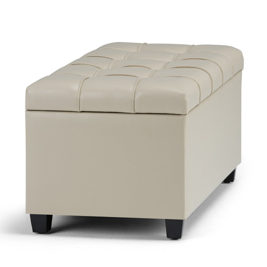Elevate your living space with this versatile storage ottoman bench in a soft Satin Cream finish. Combining sleek transitional styling with practical functionality, it offers comfortable seating, hidden storage, and refined tufted detailing—perfect for entryways, bedrooms, living rooms, or at the foot of a bed. Built with durable materials and a child-safe hinge, it’s an elegant, everyday piece that keeps clutter out of sight while enhancing your décor.