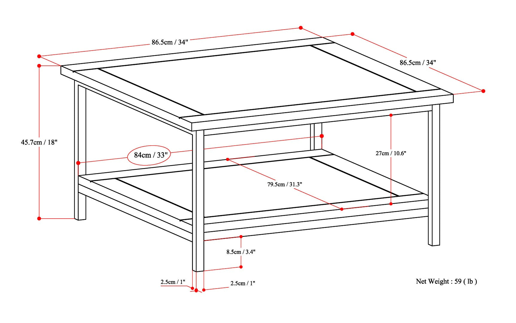 - Dimensions: 34"D x 34" W x 18"H