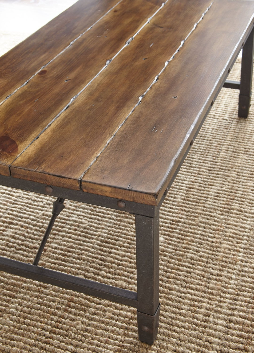 - Design Features: Plank-effect top, decorative nailhead trim, and industrial-style iron accents