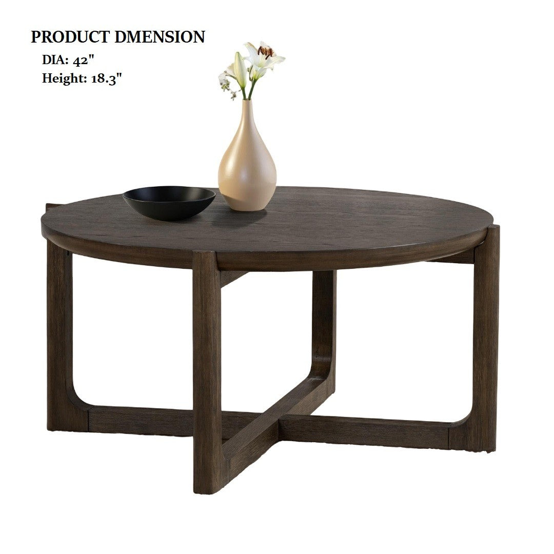 Bring refined transitional style to your living area with this 42" round cocktail table from the Vellara collection. The warm dark walnut wood top balances casual comfort with sophisticated depth, while the trestle-style base provides sturdy support and an architectural focal point. Ideal for medium to large seating arrangements, this piece is designed to be noticed without overpowering your space.