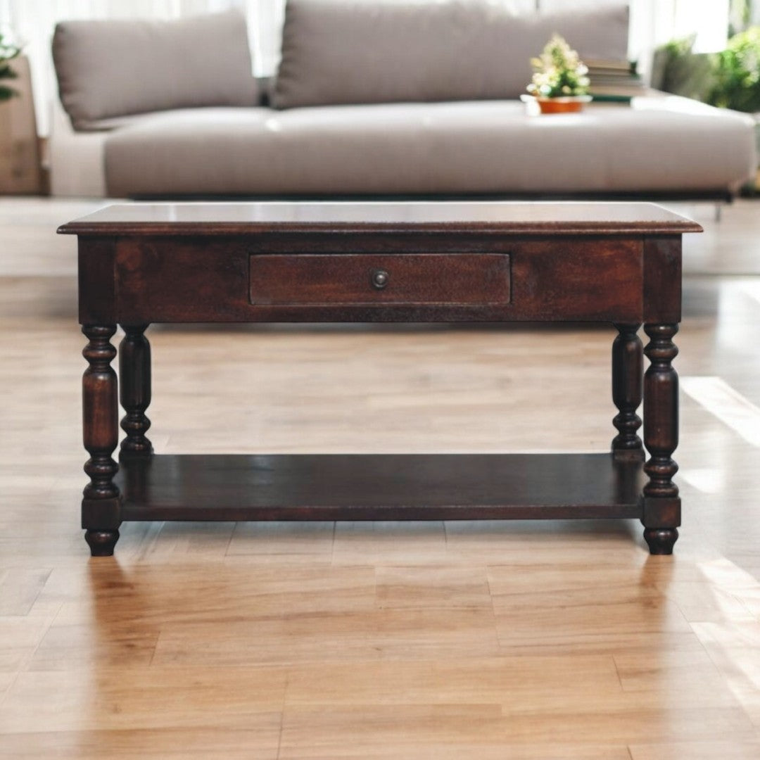 - Introducing a timeless blend of elegance and functionality, this console table is crafted from 100% solid mango wood in a rich Cherry finish. It features a single compact drawer for discreet storage and a spacious lower shelf for showcasing decor or organizing essentials. The distinctive Turned Legs add a classic charm, making it perfect for entryways, hallways, or living rooms. Durable and stylish, this piece enhances any space with its sophisticated design.