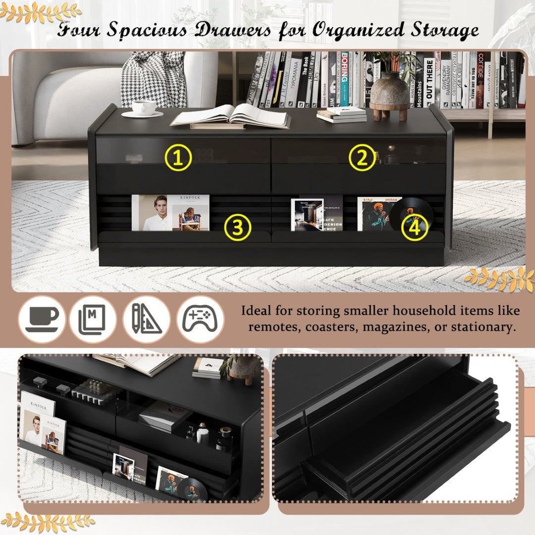 Bring vintage charm and modern utility to your living space with this refined rectangular coffee table. Thoughtfully designed with fluted detailing, tempered glass accents, four drawers and two open display shelves, it offers stylish storage and a polished focal point for living rooms, dens, or multi-use spaces. Durable materials and careful construction make it both decorative and practical for everyday use.