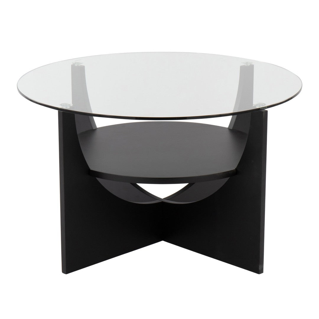 - Materials: Tempered clear glass top with sturdy black wood bases and a matching circular lower shelf