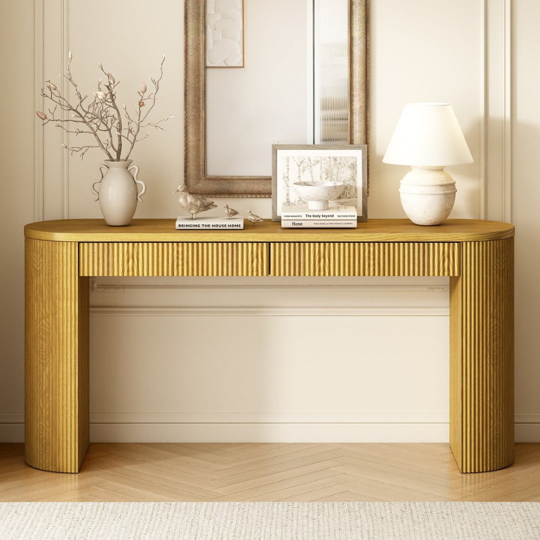 Give your entryway, hallway, or living room an instant style and storage upgrade with this refined console table. Combining a generous top surface, two smooth-glide drawers, and arched leg details with a subtle stripe design, this piece blends classic form with practical function—ideal for displaying decor, holding keys and mail, or supporting lamps and plants.