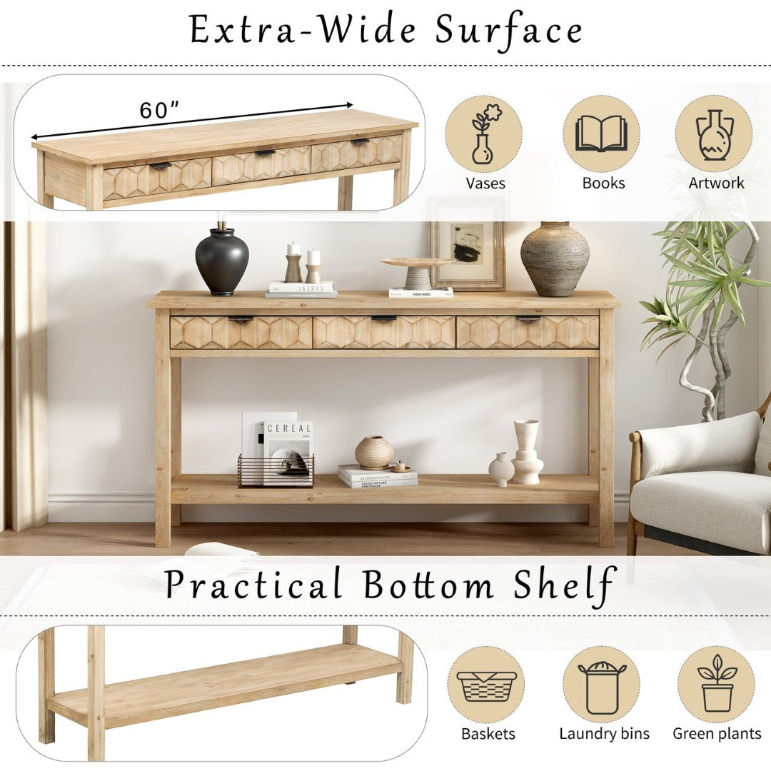 This elegant console table blends modern design with practical storage to create a versatile focal point for entryways, living rooms, hallways, or studies. With a smooth painted finish over natural fir veneer, distinctive honeycomb-patterned drawer fronts, and sturdy solid fir legs, it offers refined texture, durable construction, and multi-functional organization for everyday essentials and decorative displays.