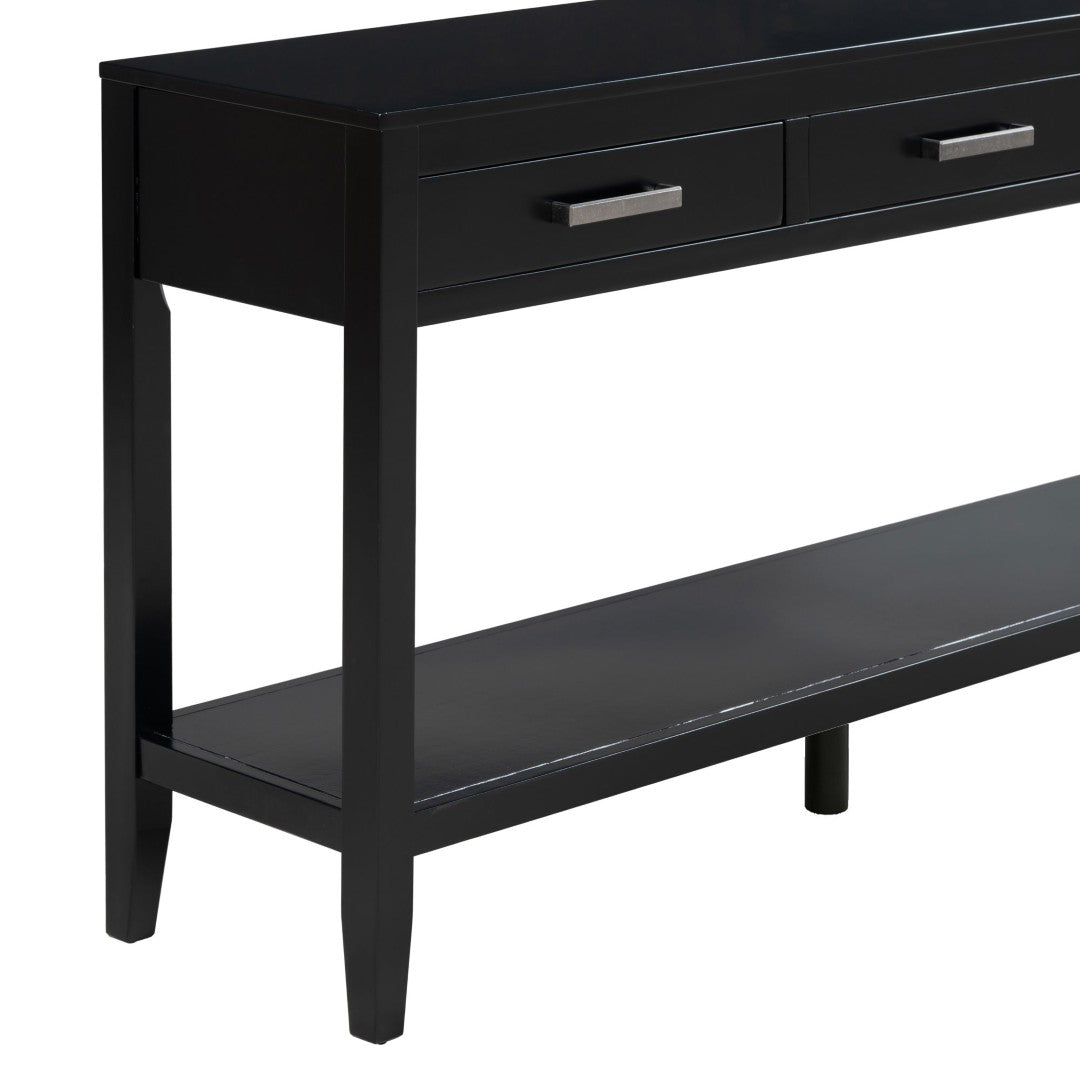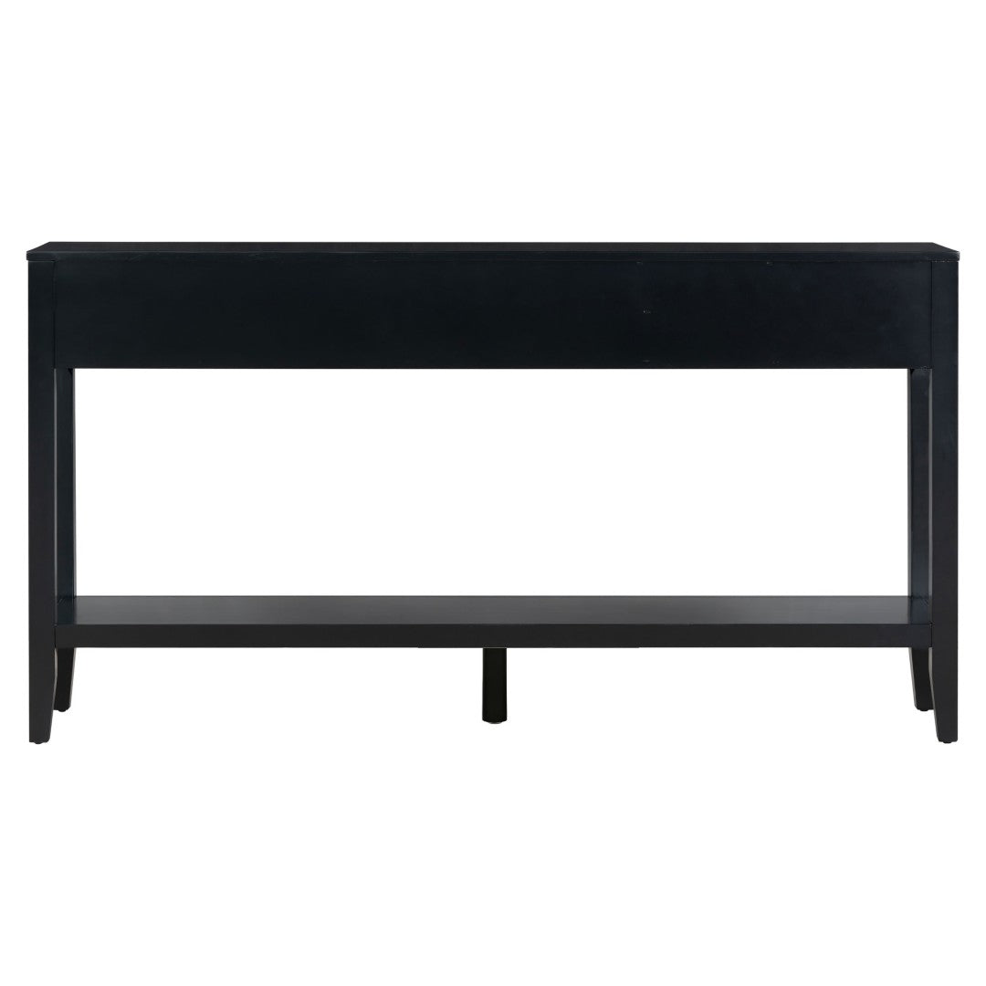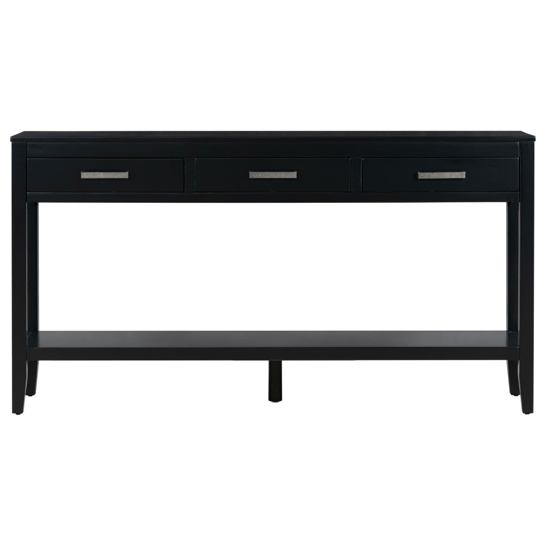 Bring farmhouse charm and everyday practicality into your home with this long, minimalist console table. Designed for entryways, living rooms, hallways or behind sofas, it pairs a wide, easy-care painted surface with three smooth-glide drawers and an open bottom shelf to keep essentials organized and surfaces clutter-free. Durable materials and adjustable feet ensure stable, long-lasting use on a variety of floors while iron handles add a subtle industrial accent.