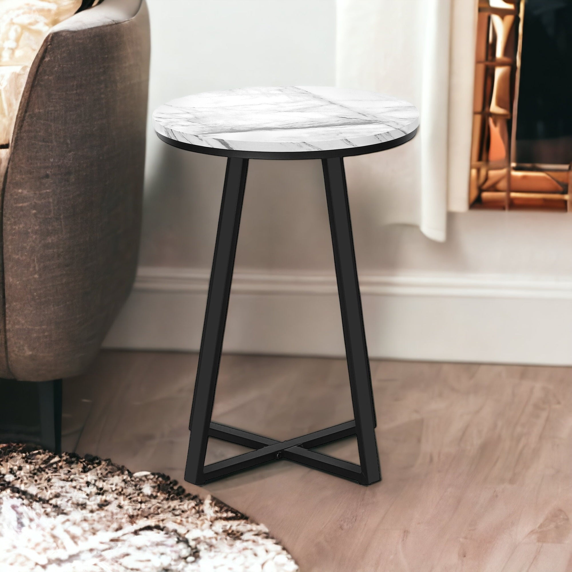 - Bring a modern tone to your living room, office space, family room or den with this stylish white marble-look / black metal round top end table