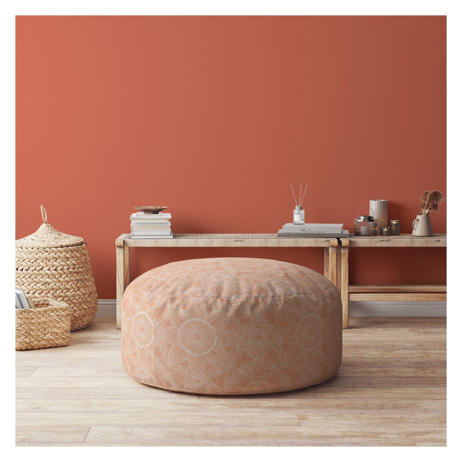 - Upholstered floral ottoman in vibrant orange color.