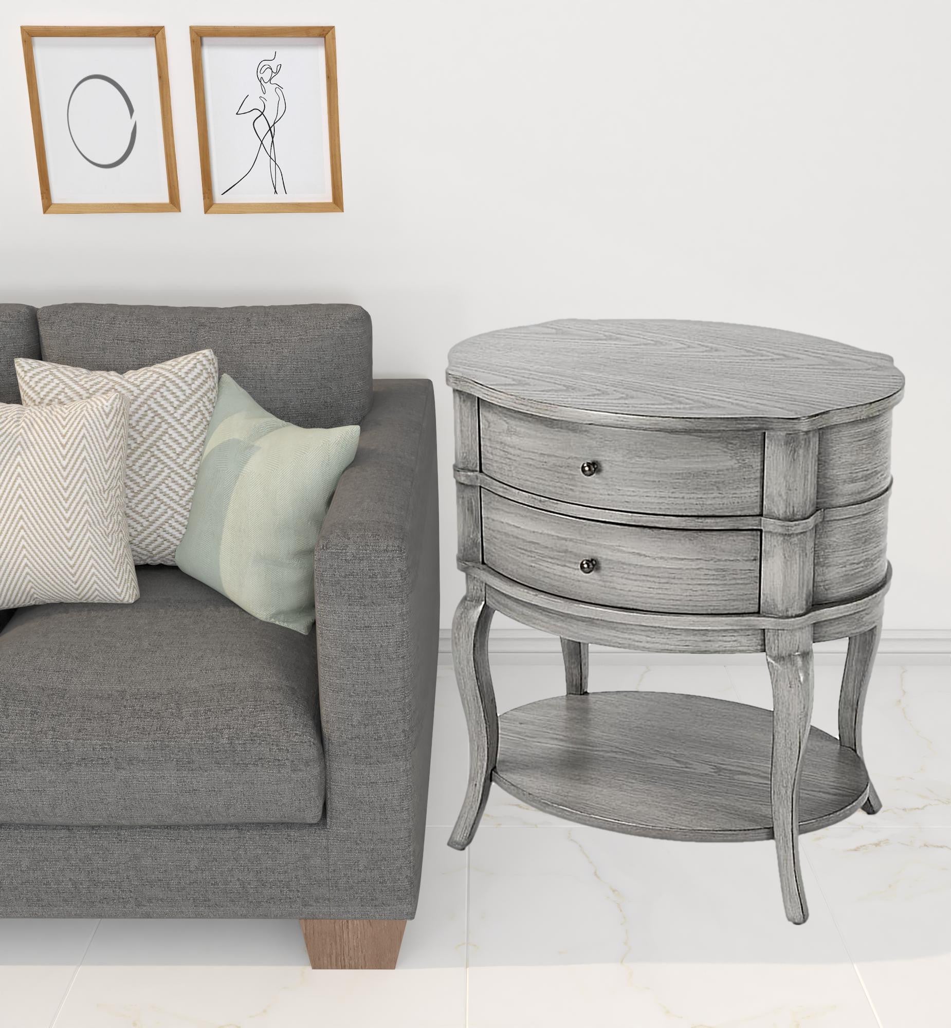 - Unique design oval side or end table features 3 drawers and a shelf for lots of storage options.