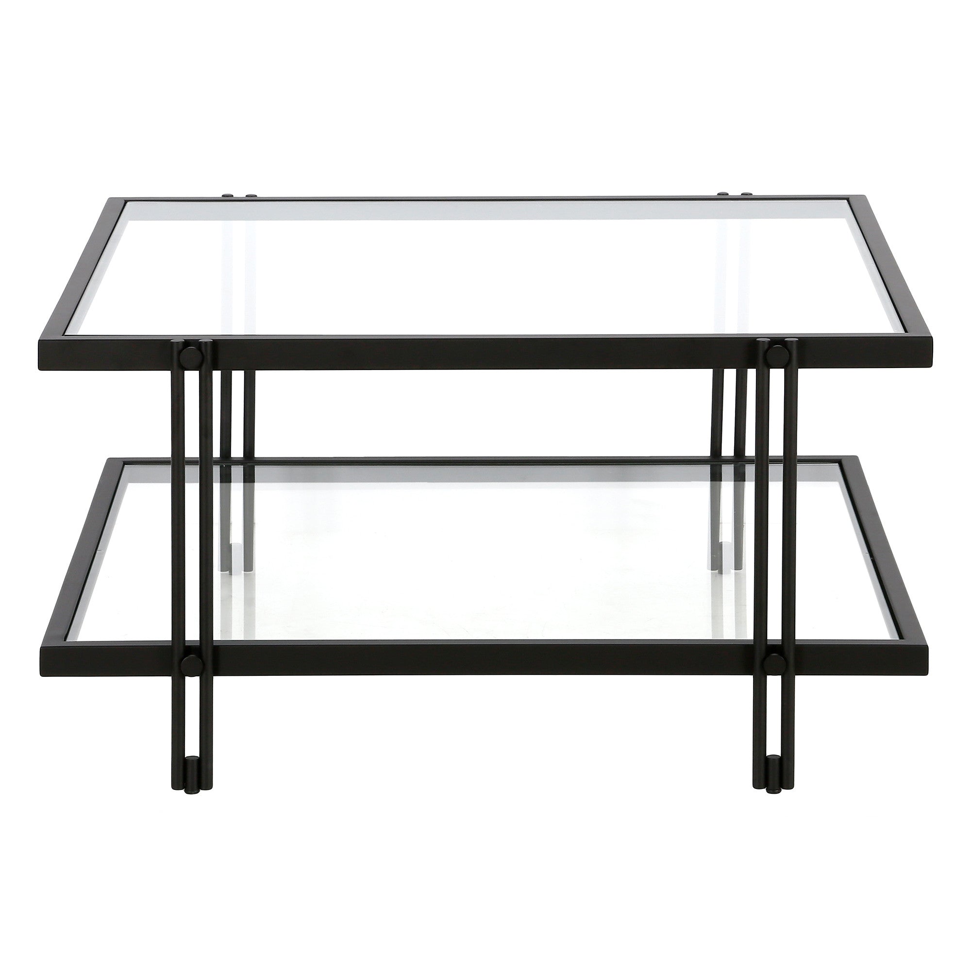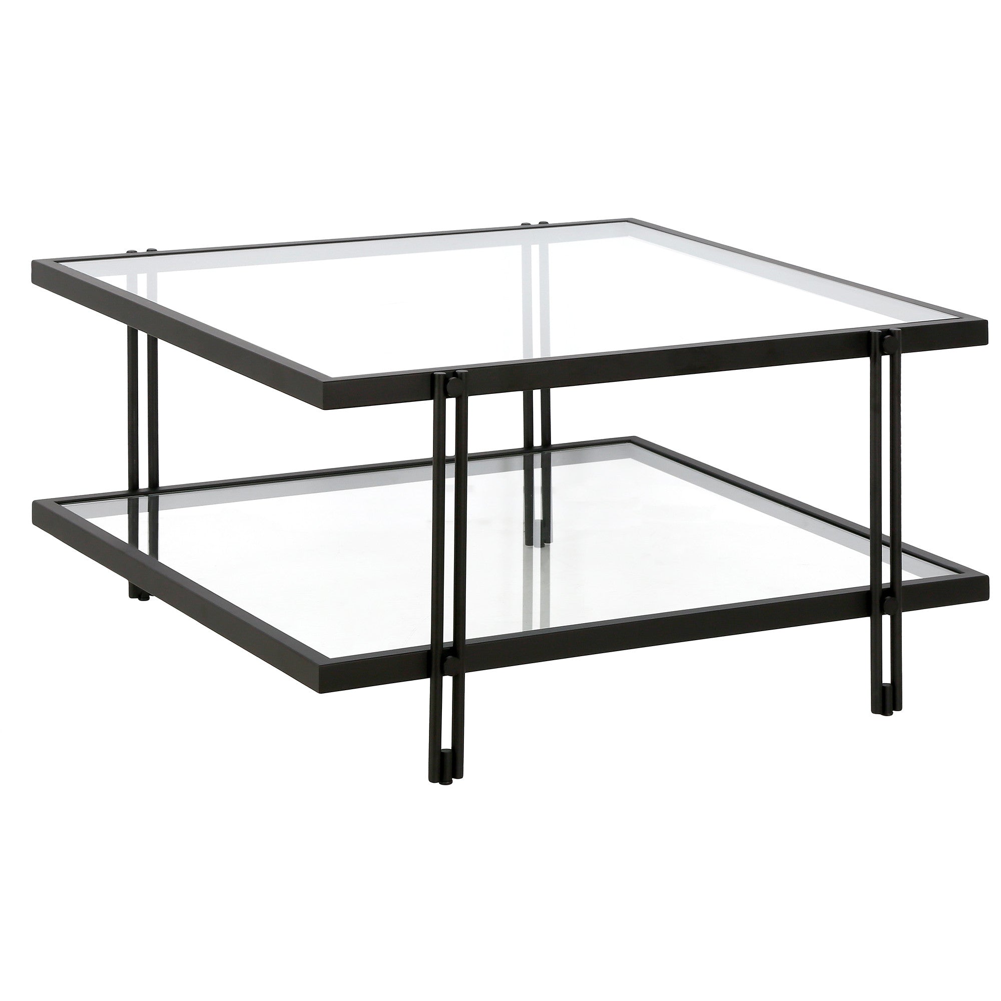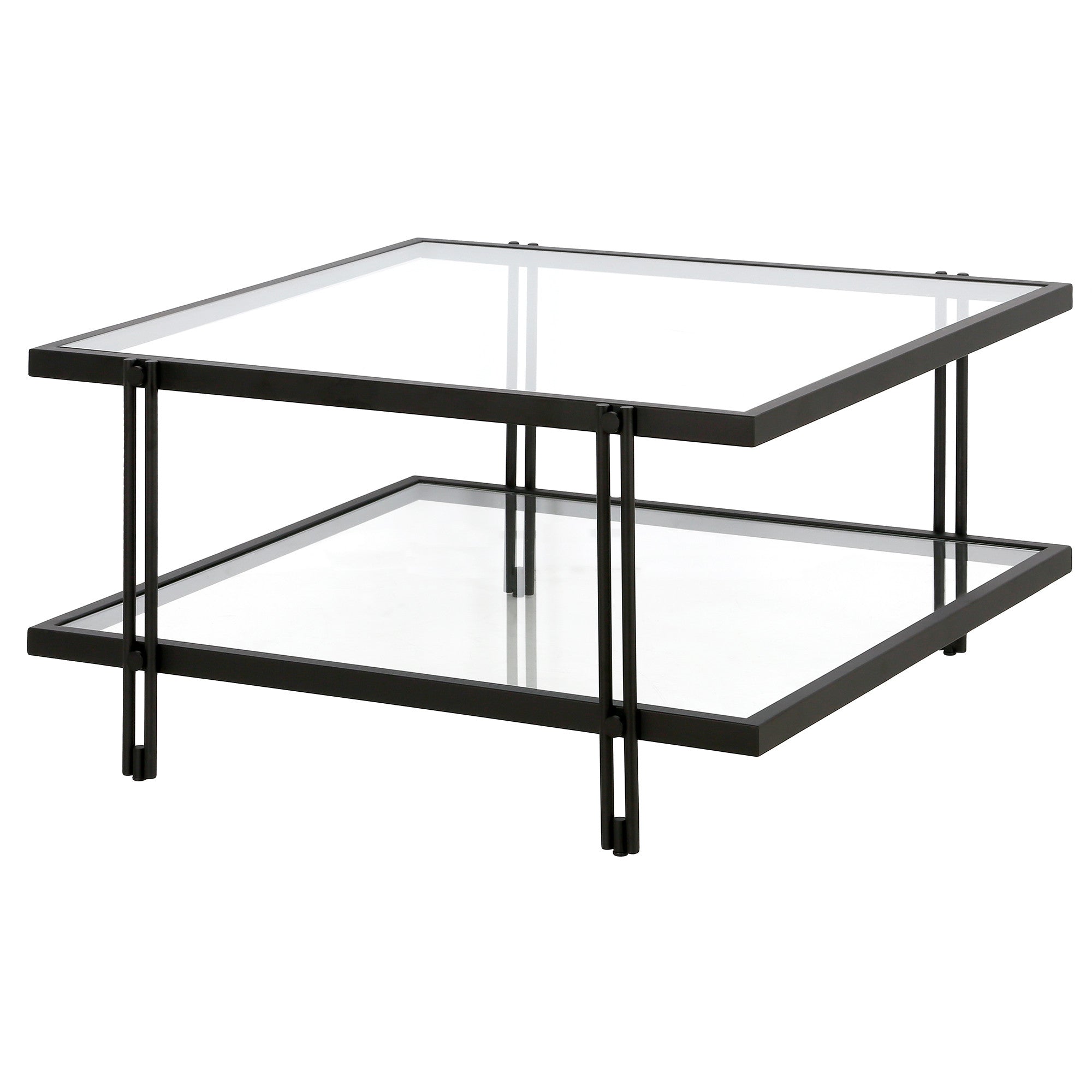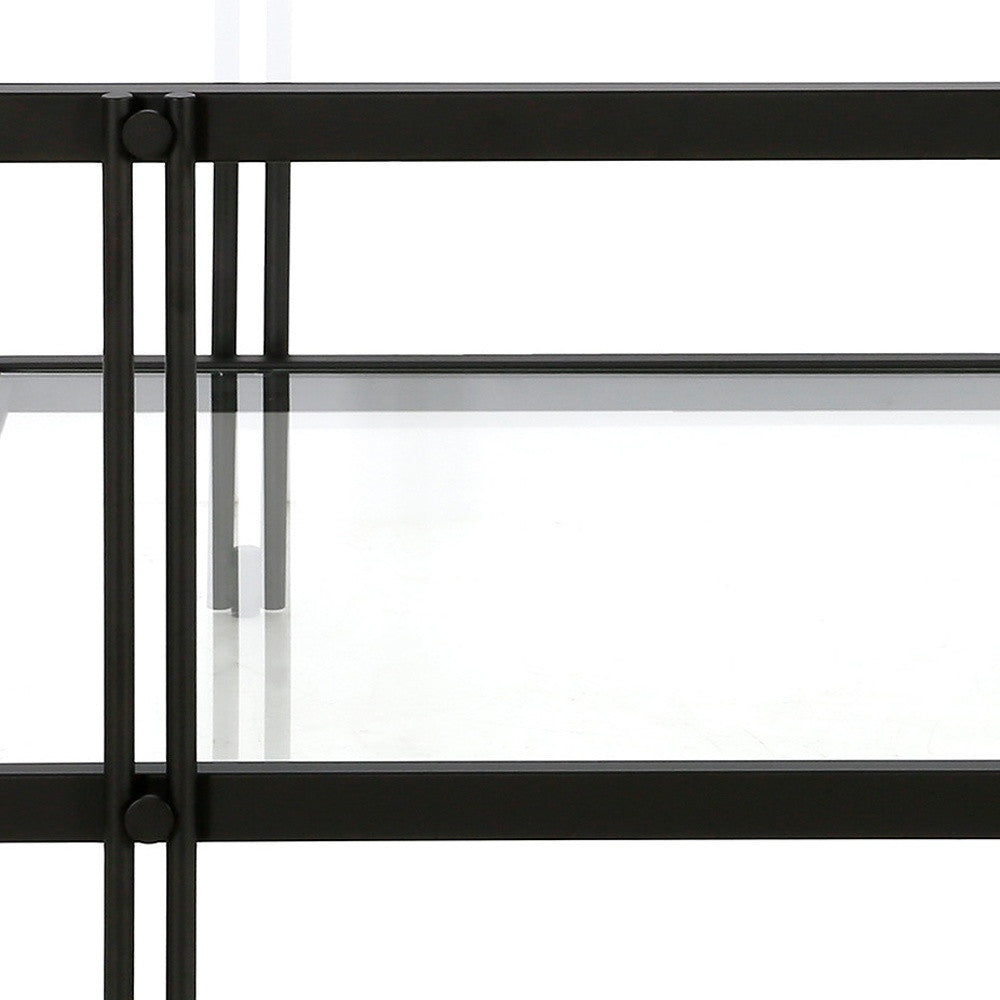 - Sleek black coffee table with a glass top and steel base.