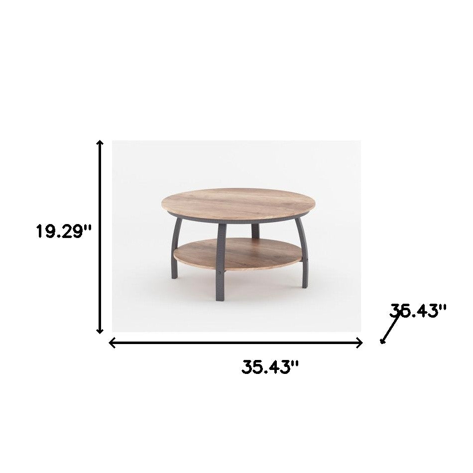 - Good looking two-tier Round coffee table with black solid metal frame and natural wood looking table surfaces.