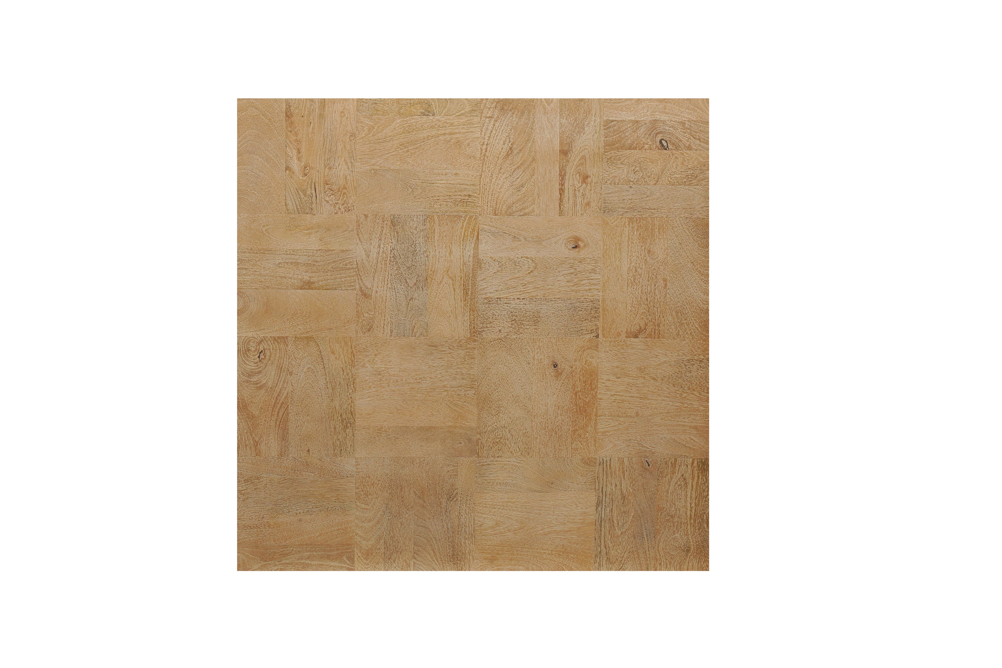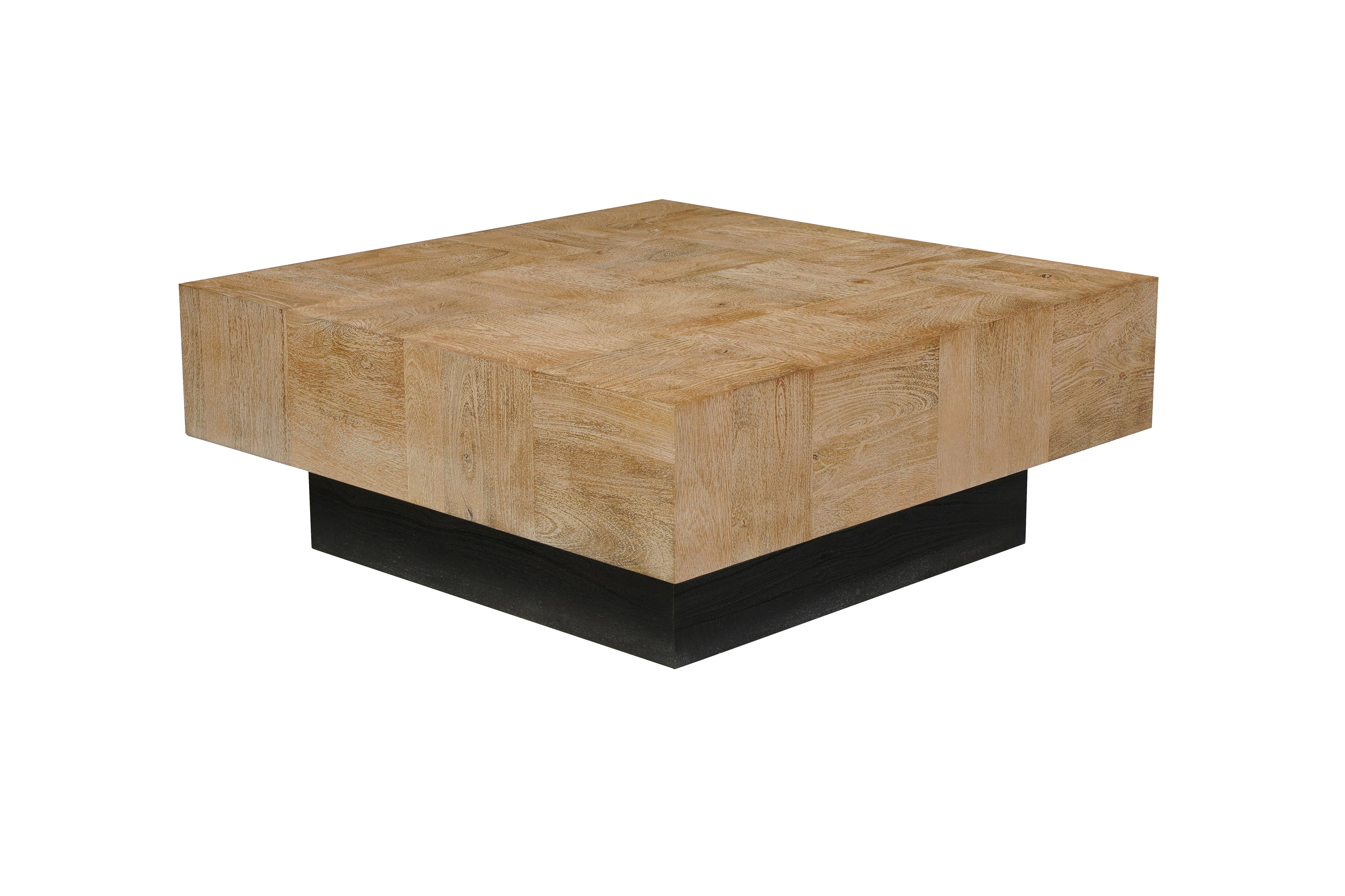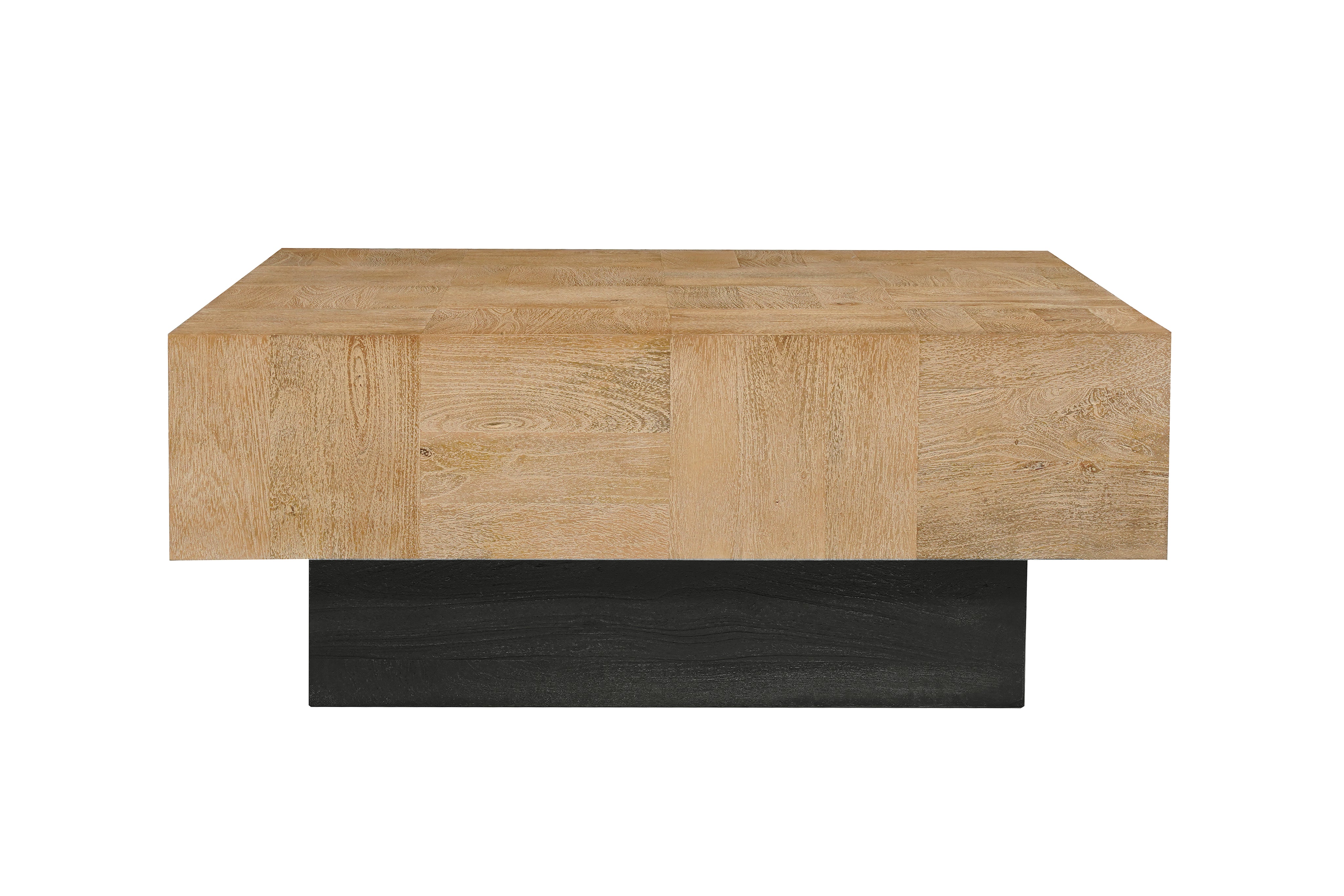 - Solid wood coffee table with a rich brown top and a sleek black base.