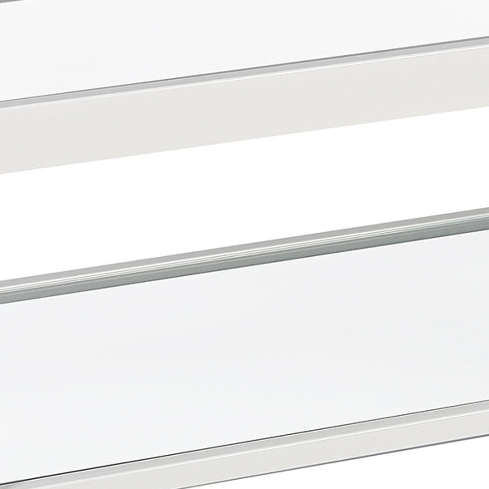 - Minimalist steel frame and glass coffee table with bottom storage shelf.
