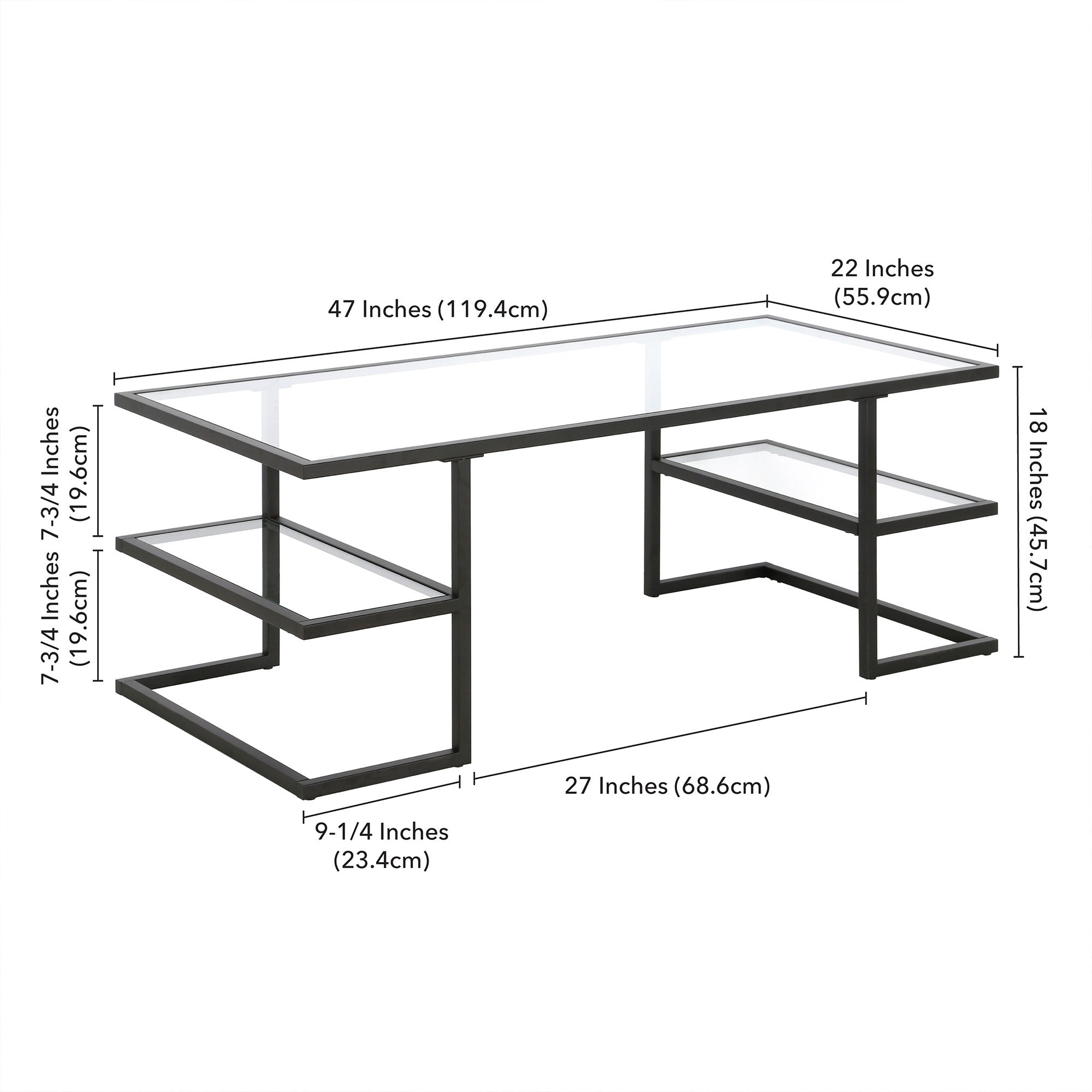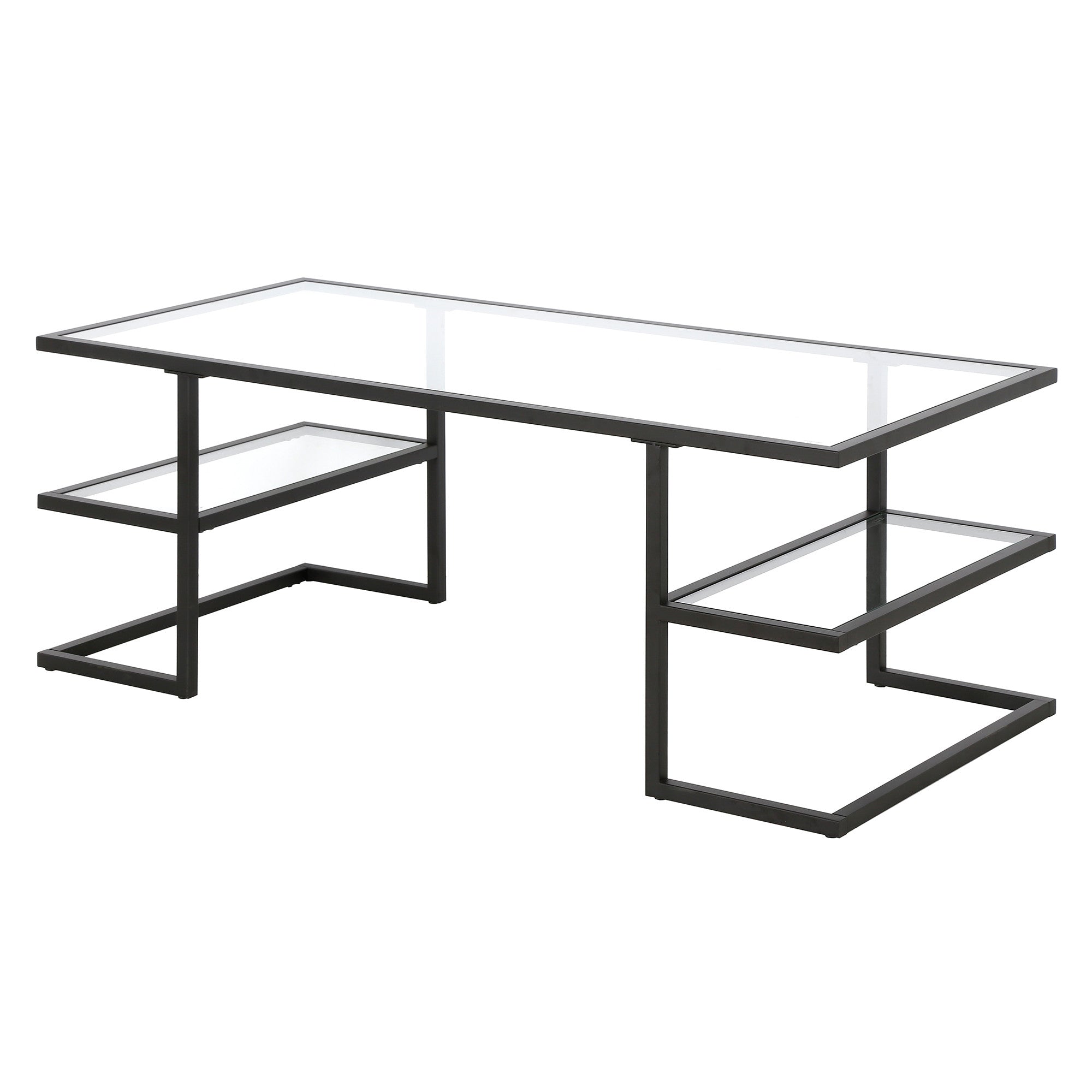 - Sleek black coffee table with a glass top and steel base.