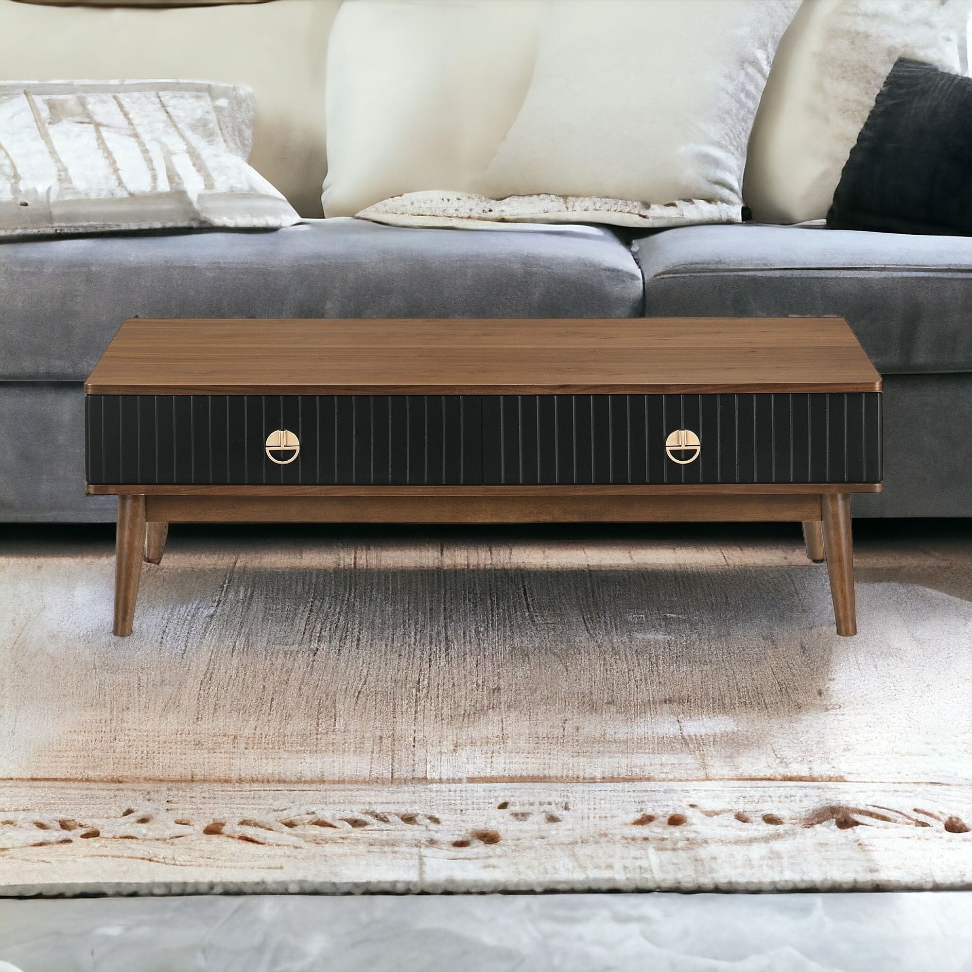 - Stylish coffee table with a rich brown top and sleek black base.
