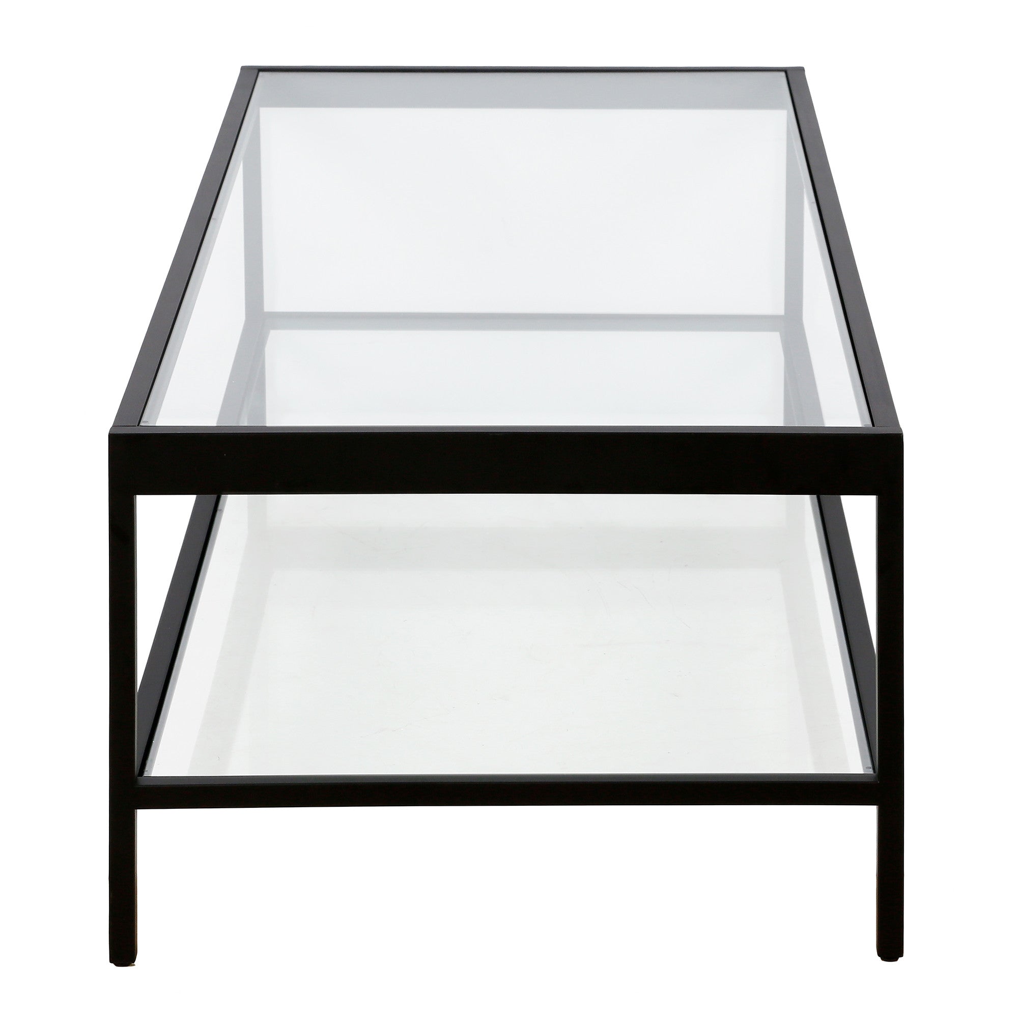 - Minimalist steel frame and glass coffee table with bottom storage shelf. Features a large and wide table top surface area.