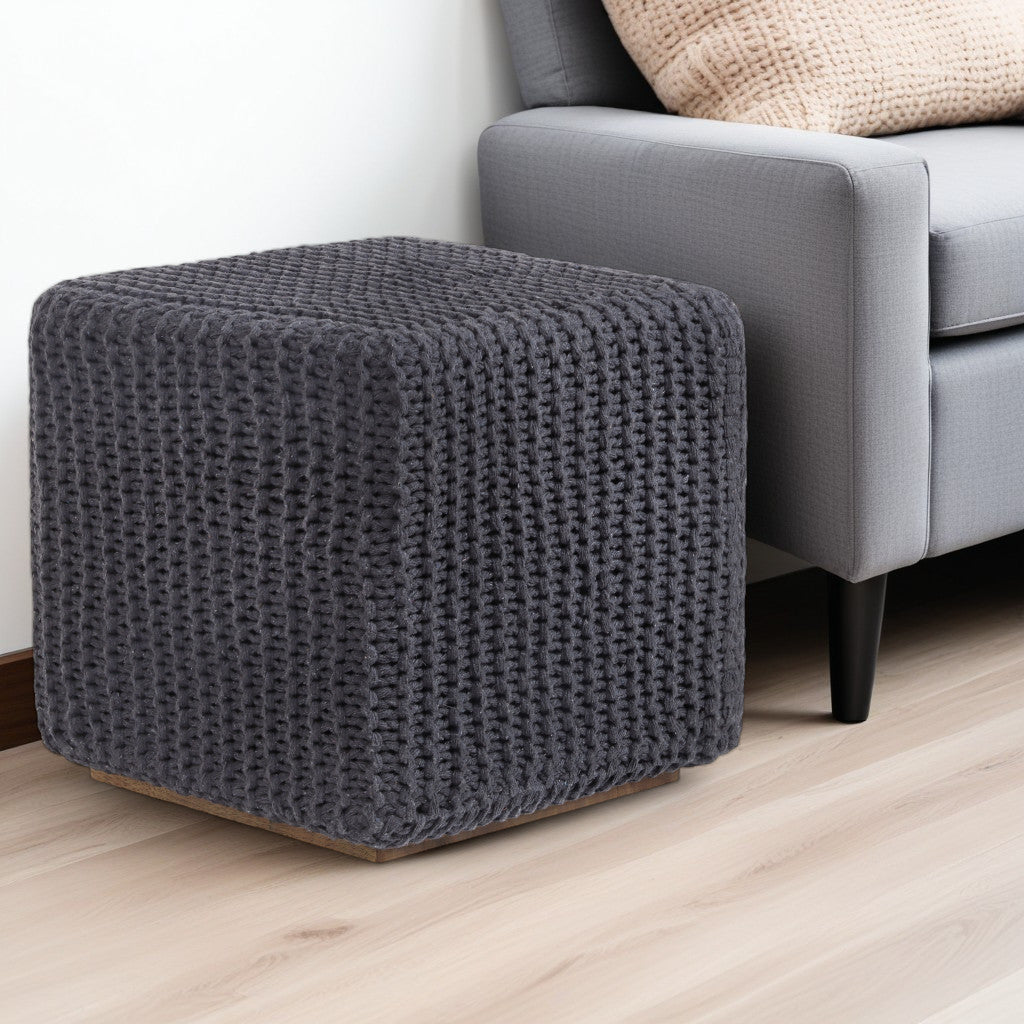 - Upholstered ottoman in a stylish light gray color.