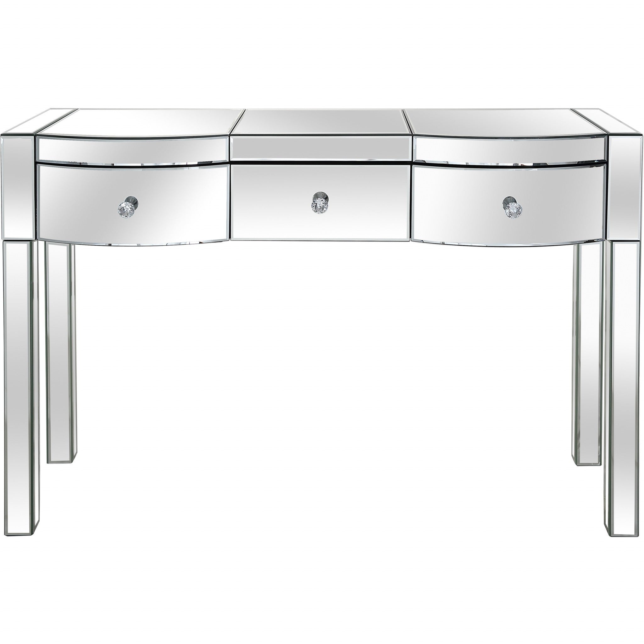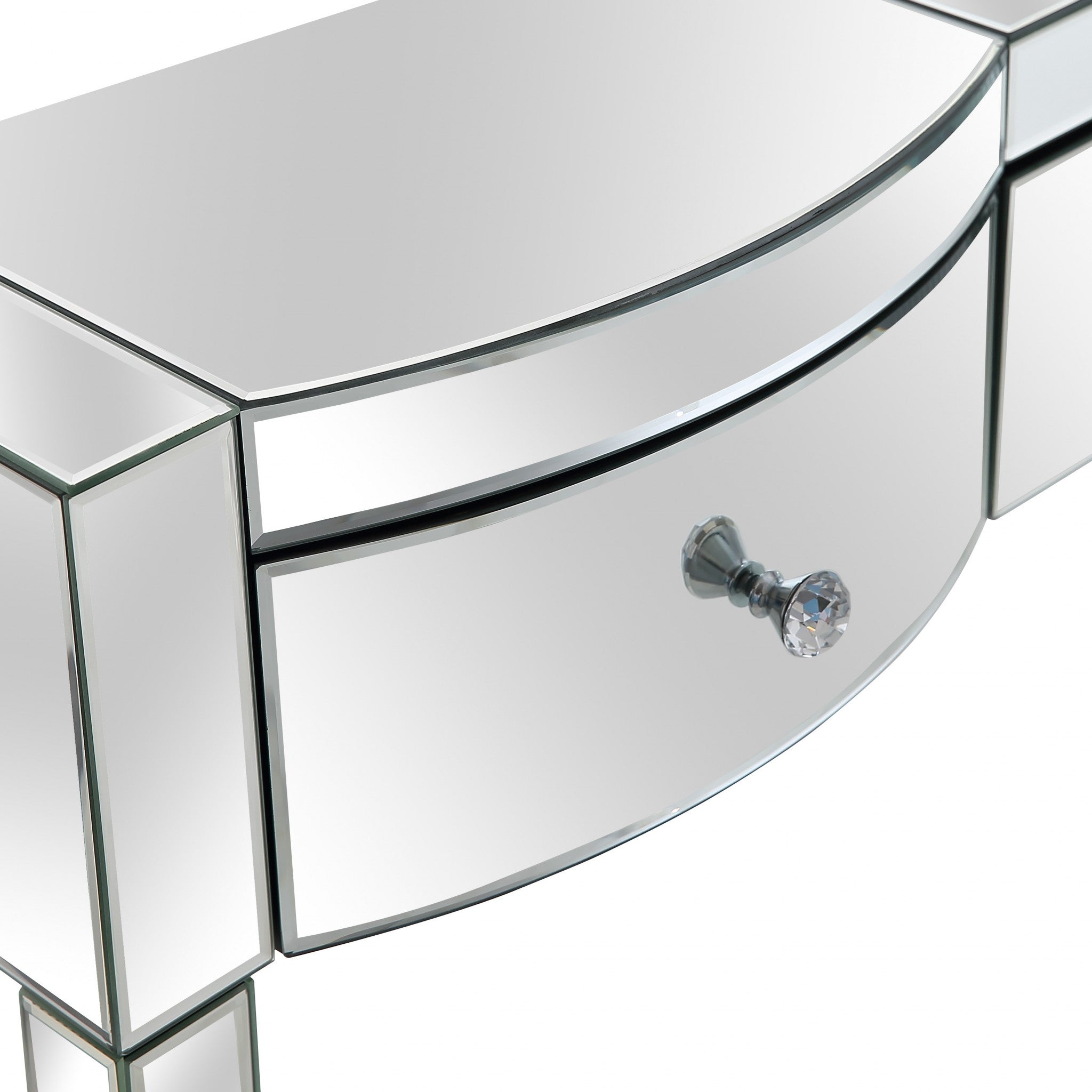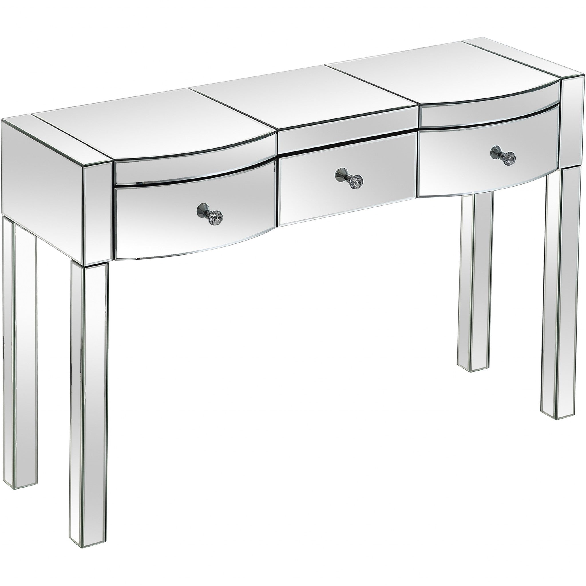 - this fully mirrored straight lined console is characterized by its drawers