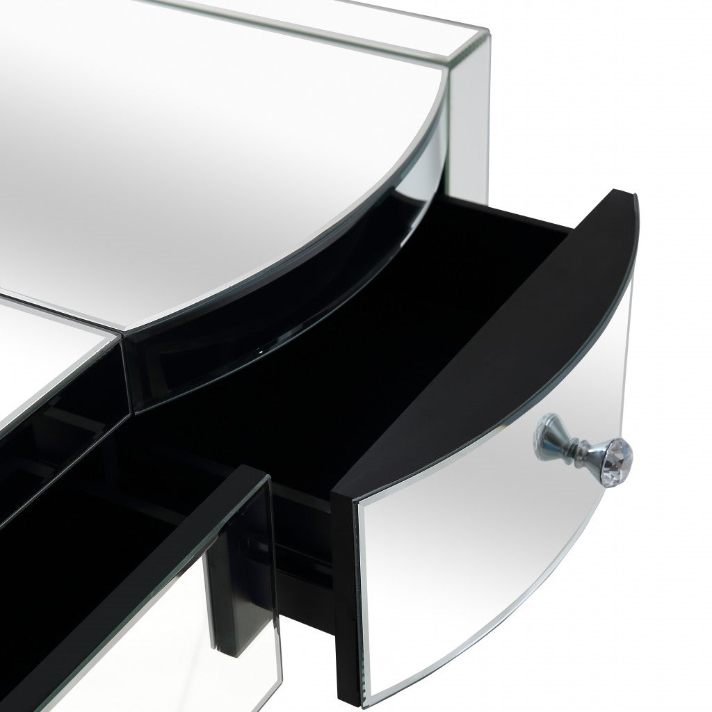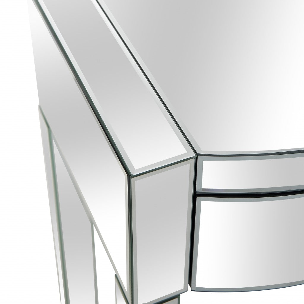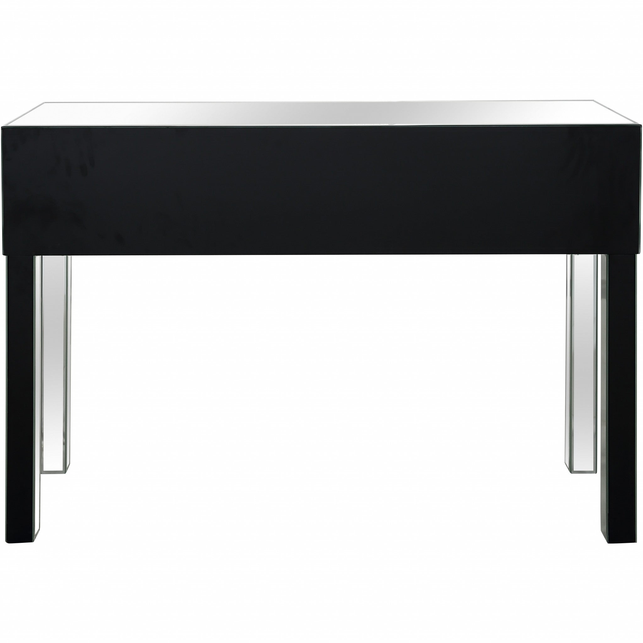 - this fully mirrored straight lined console is characterized by its drawers