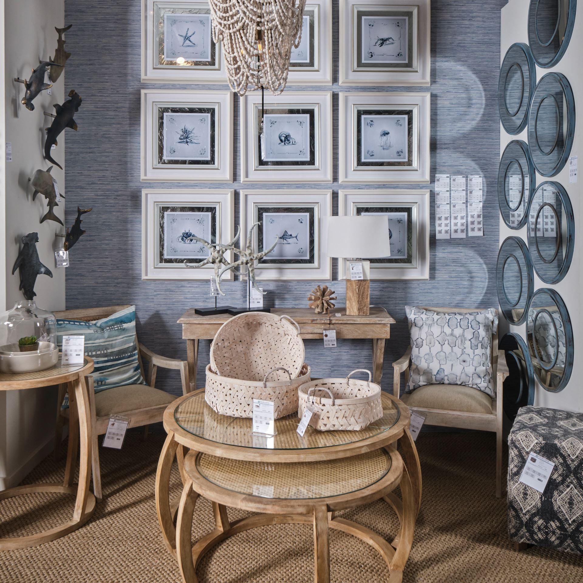 - set of two round, wooden coffee tables that feature a slated base and glass-lined, woven cane top.
