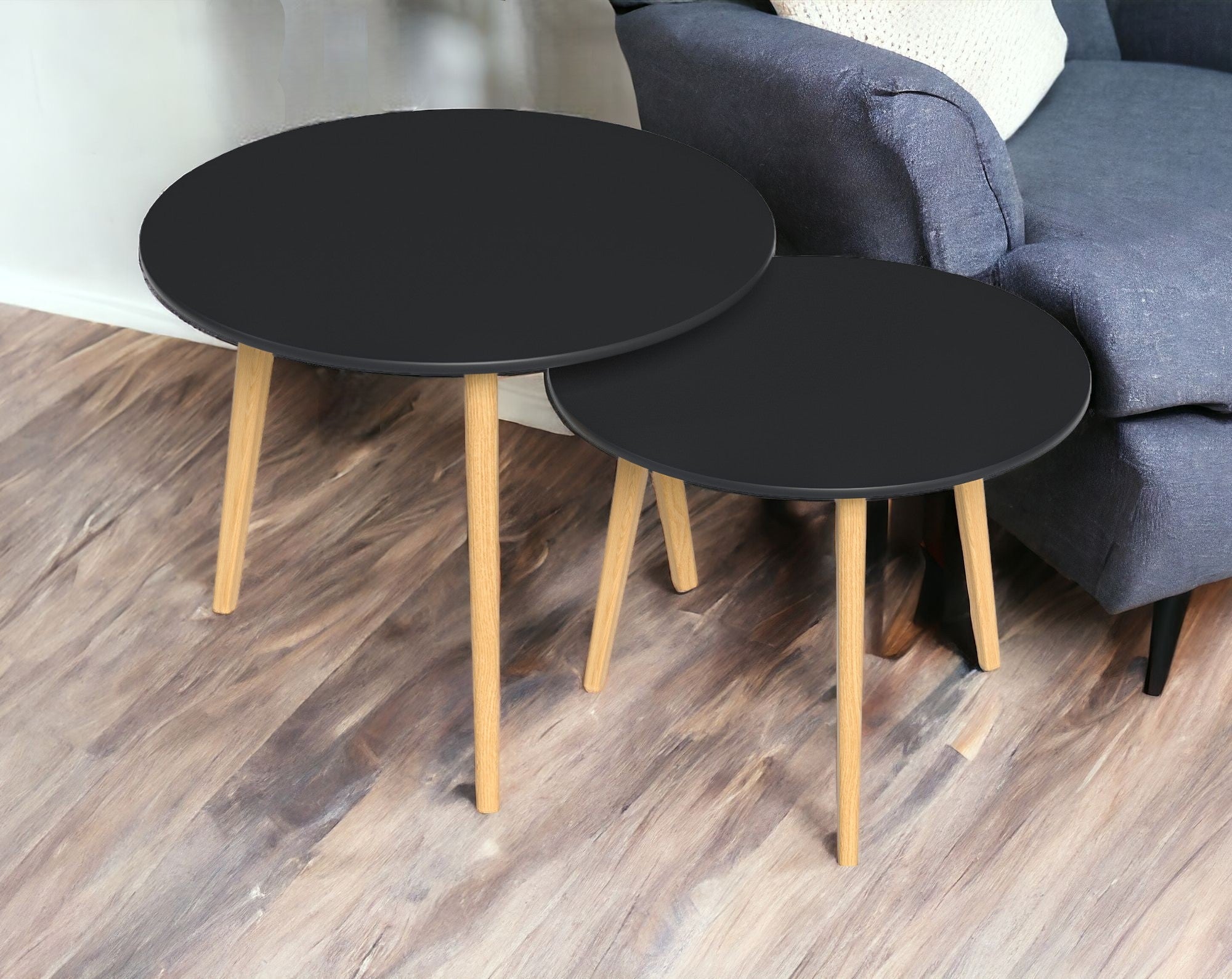 - Modern and sleek black round MDF table set features natural color bamboo legs.